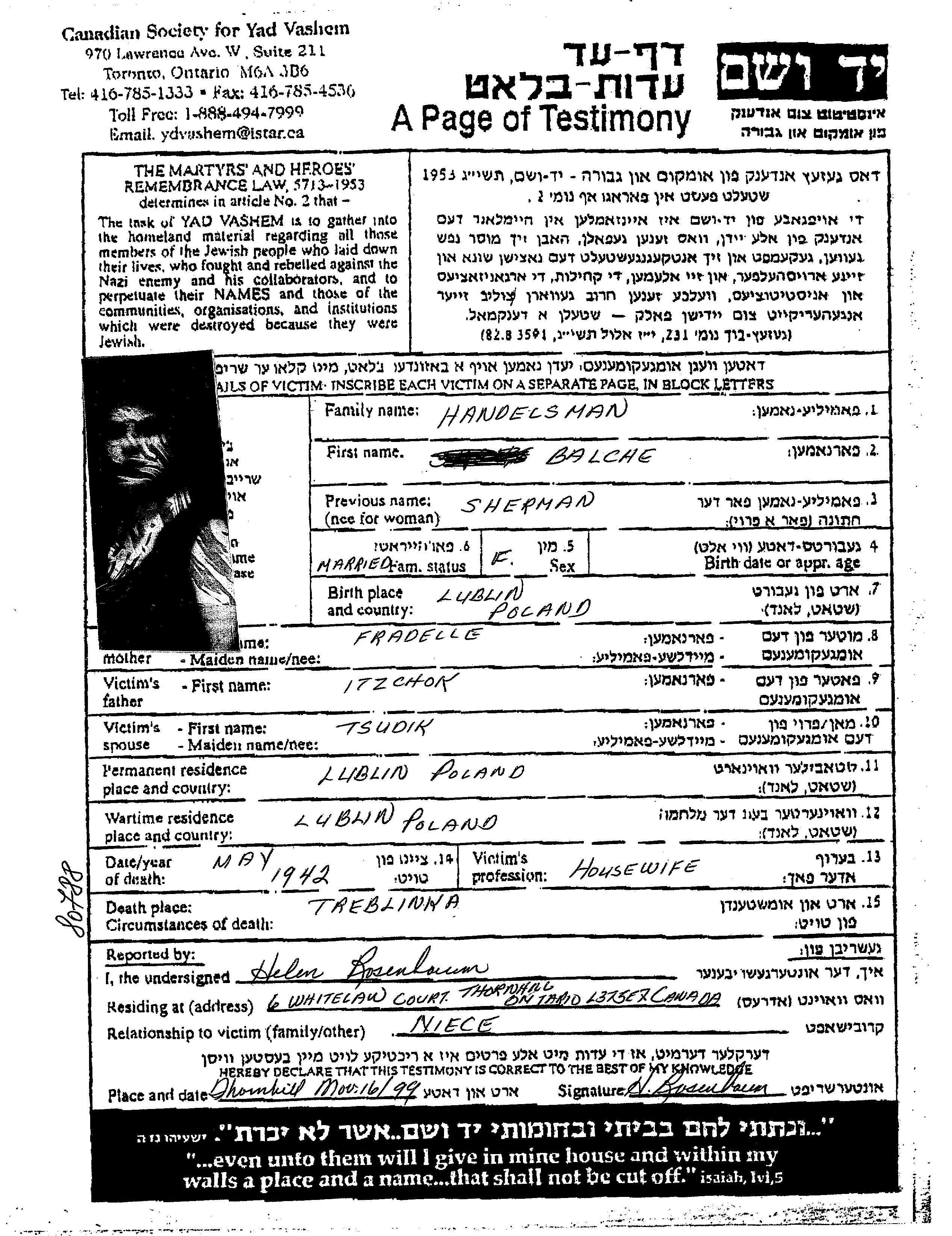 Balche Handelsman née Sherman est née à Lublin, Pologne. Elle était Femme au foyer. Avant la seconde guerre mondiale elle vivait à Lublin, Pologne.