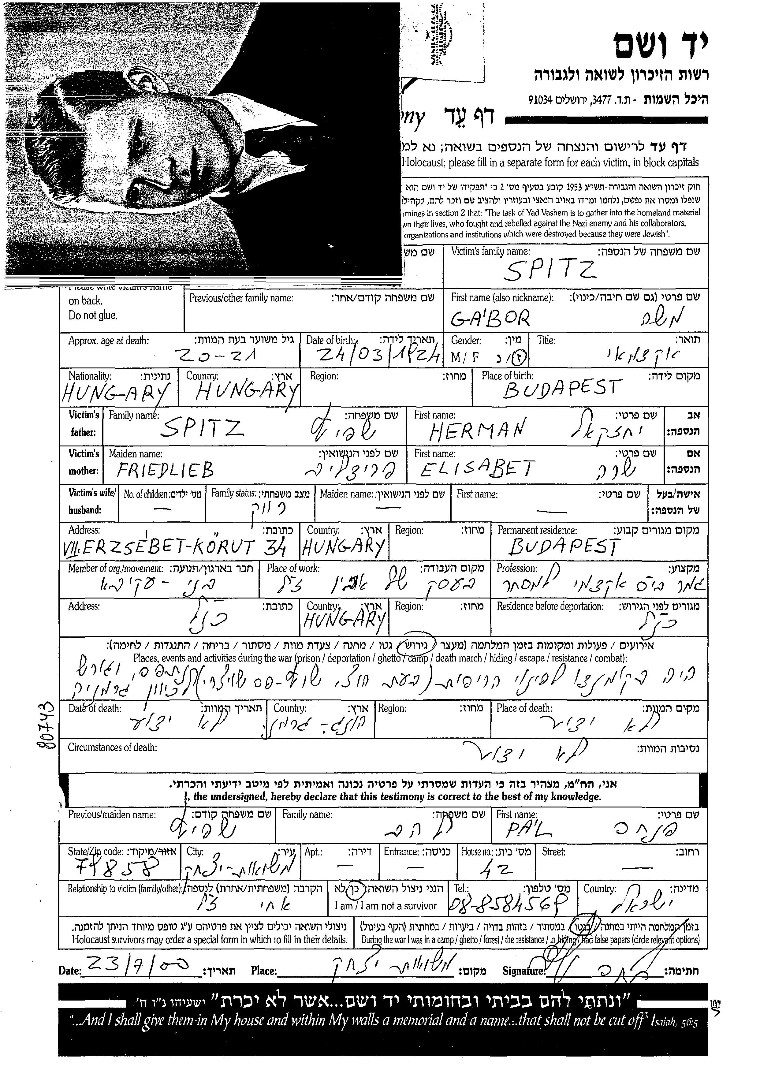 Spitz Gabor Moshe 1924 Budapest, Hongrie Feuille de témoignage