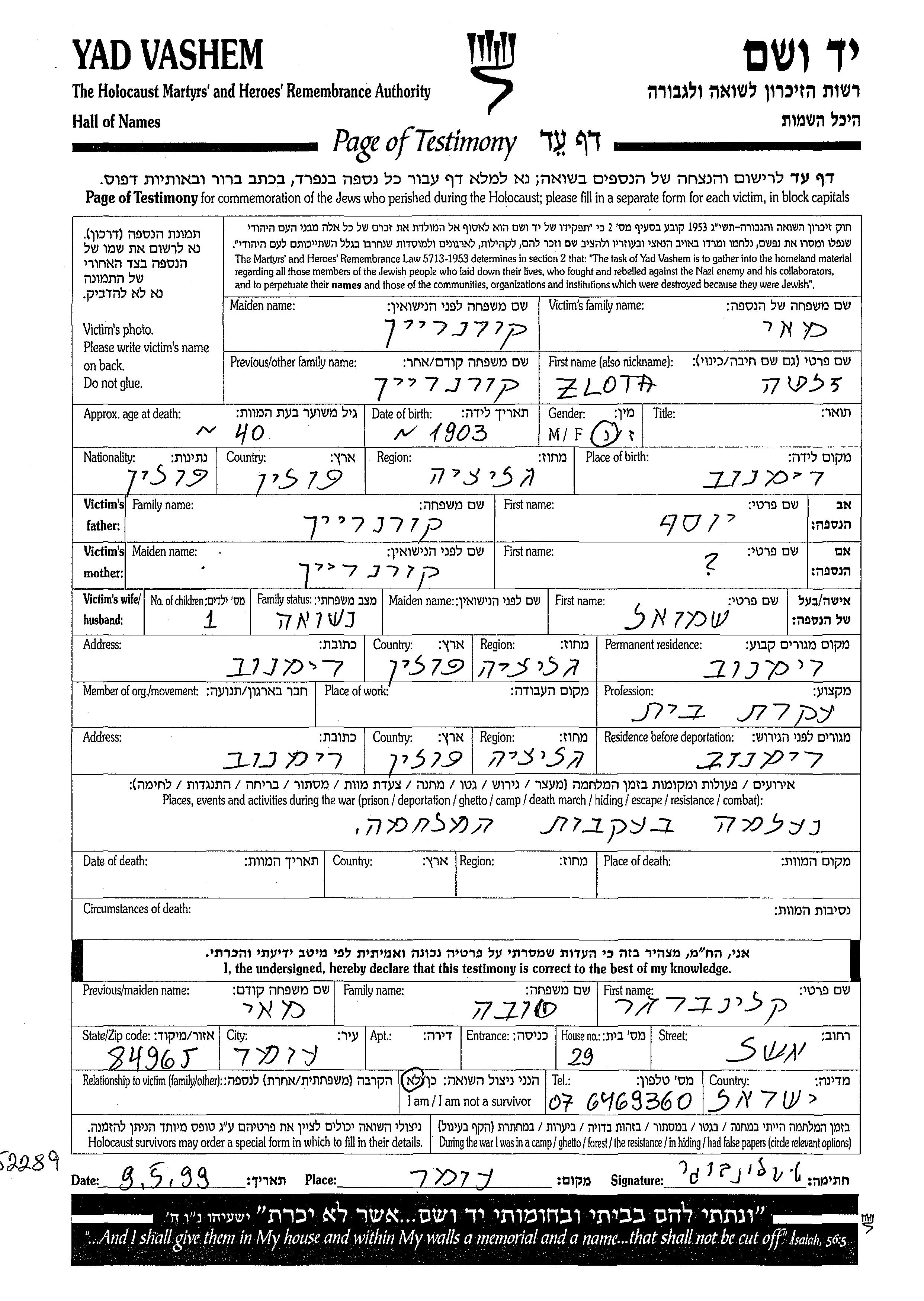 May | Zlata | 1907 | Rimanov, Pologne | Feuille de témoignage |