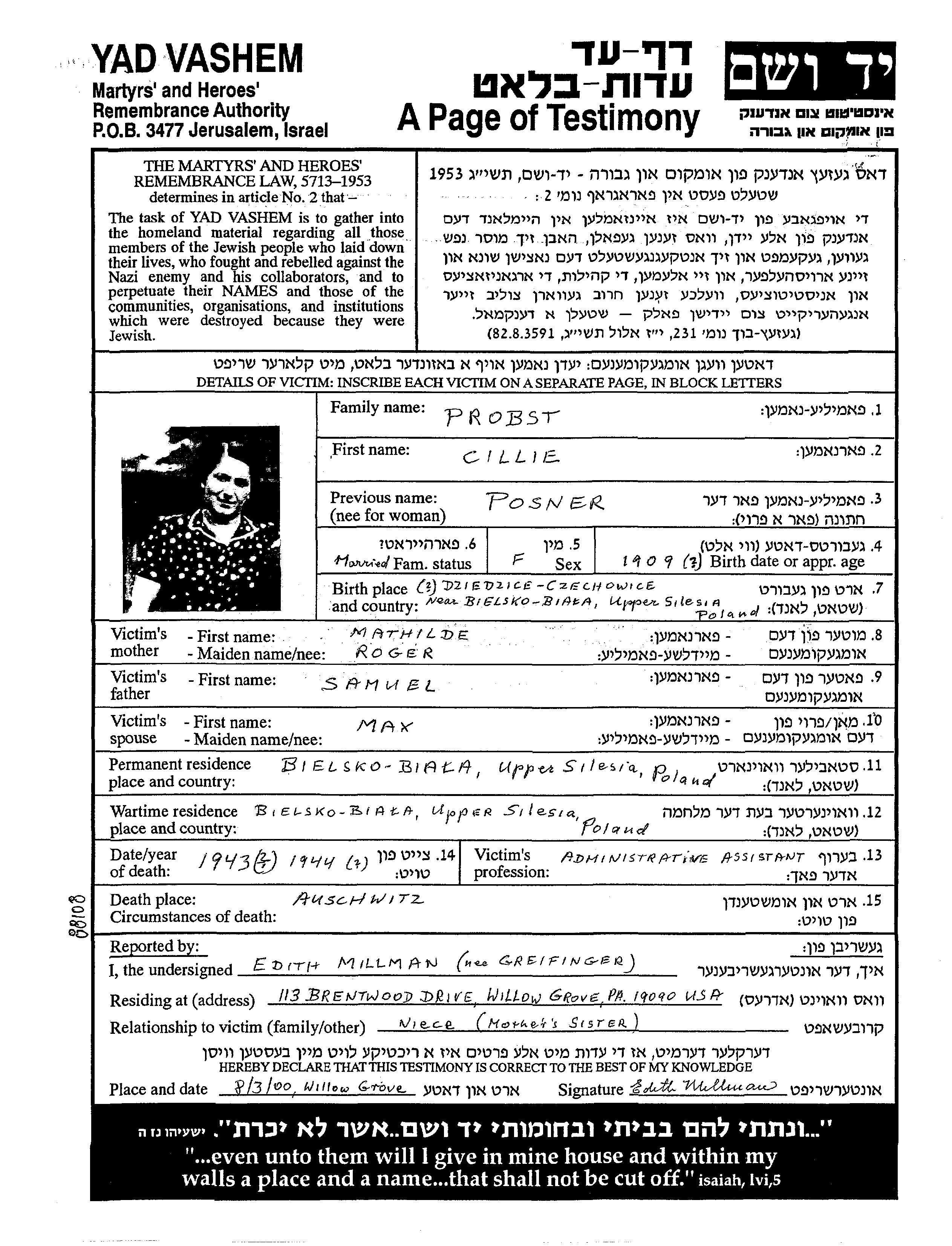 Probst | Cillie | 1909 | Bielsko Biala, Pologne | Feuille de témoignage |