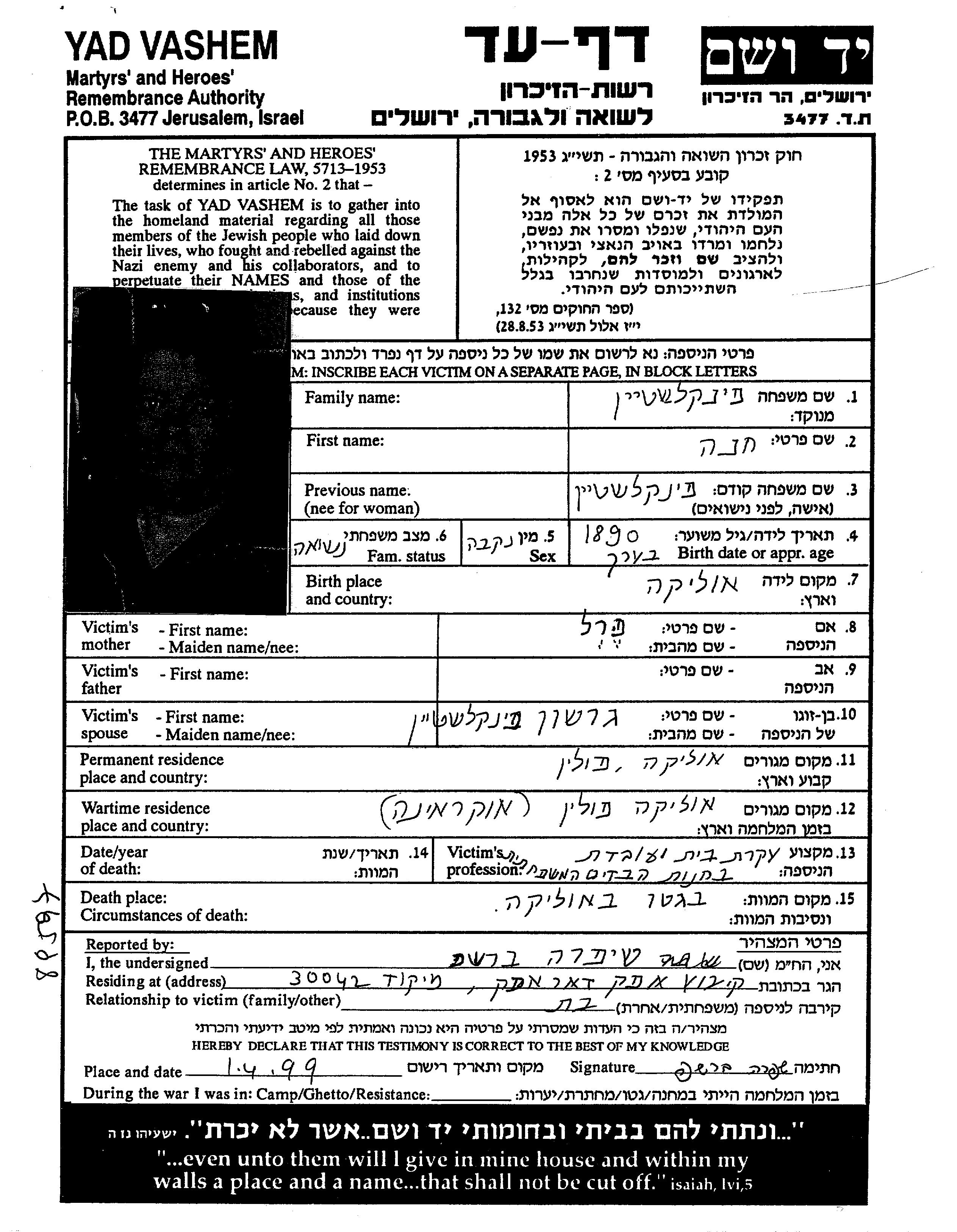 Yad Vashem - Pages of Testimony Names Memorial Collection