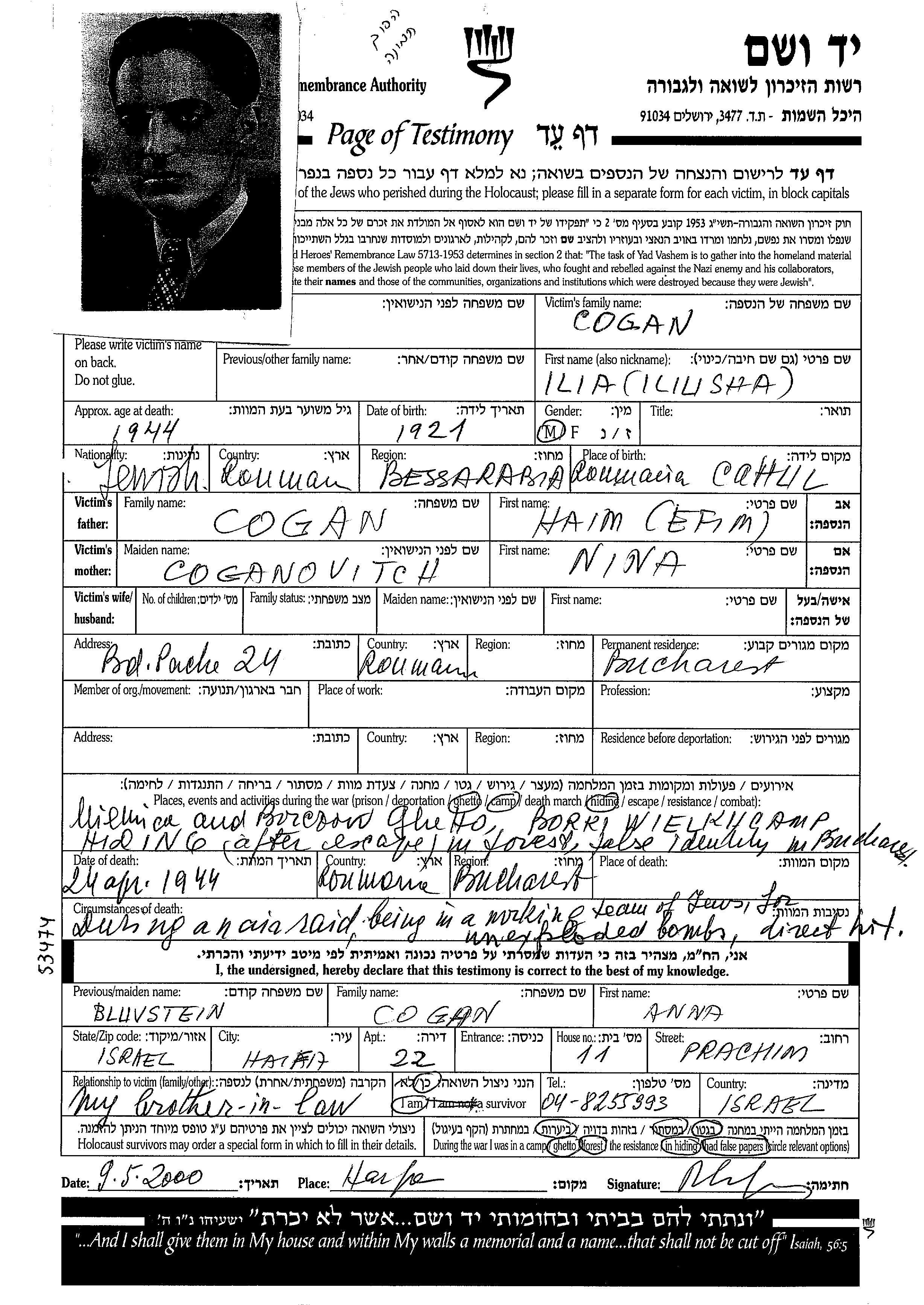 Cogan Ilia 1921 Bucuresti, Roumanie Feuille de témoignage