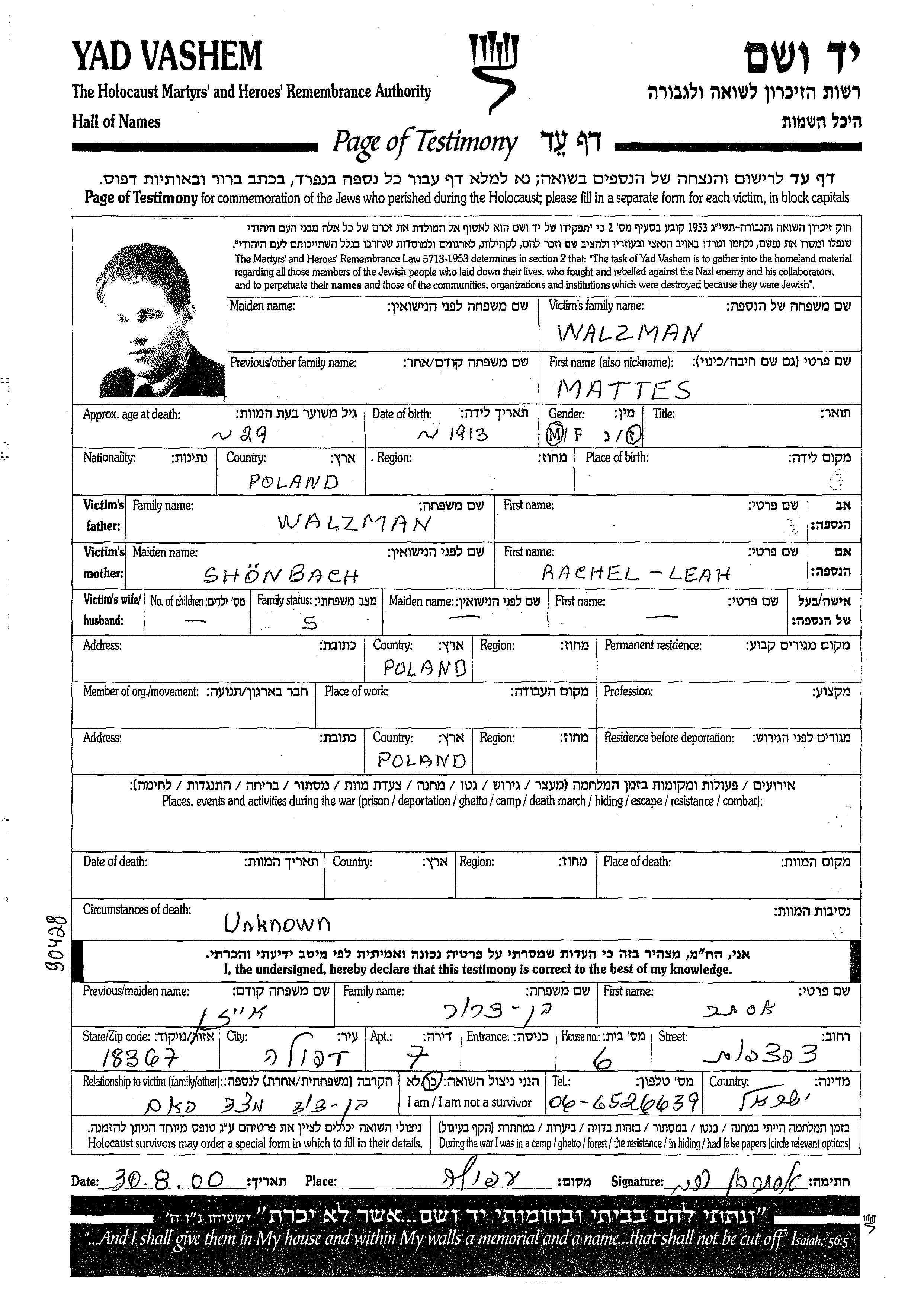 Mattes Walzman est né à Pologne en 1913. Avant la seconde guerre mondiale il vivait à Pologne.