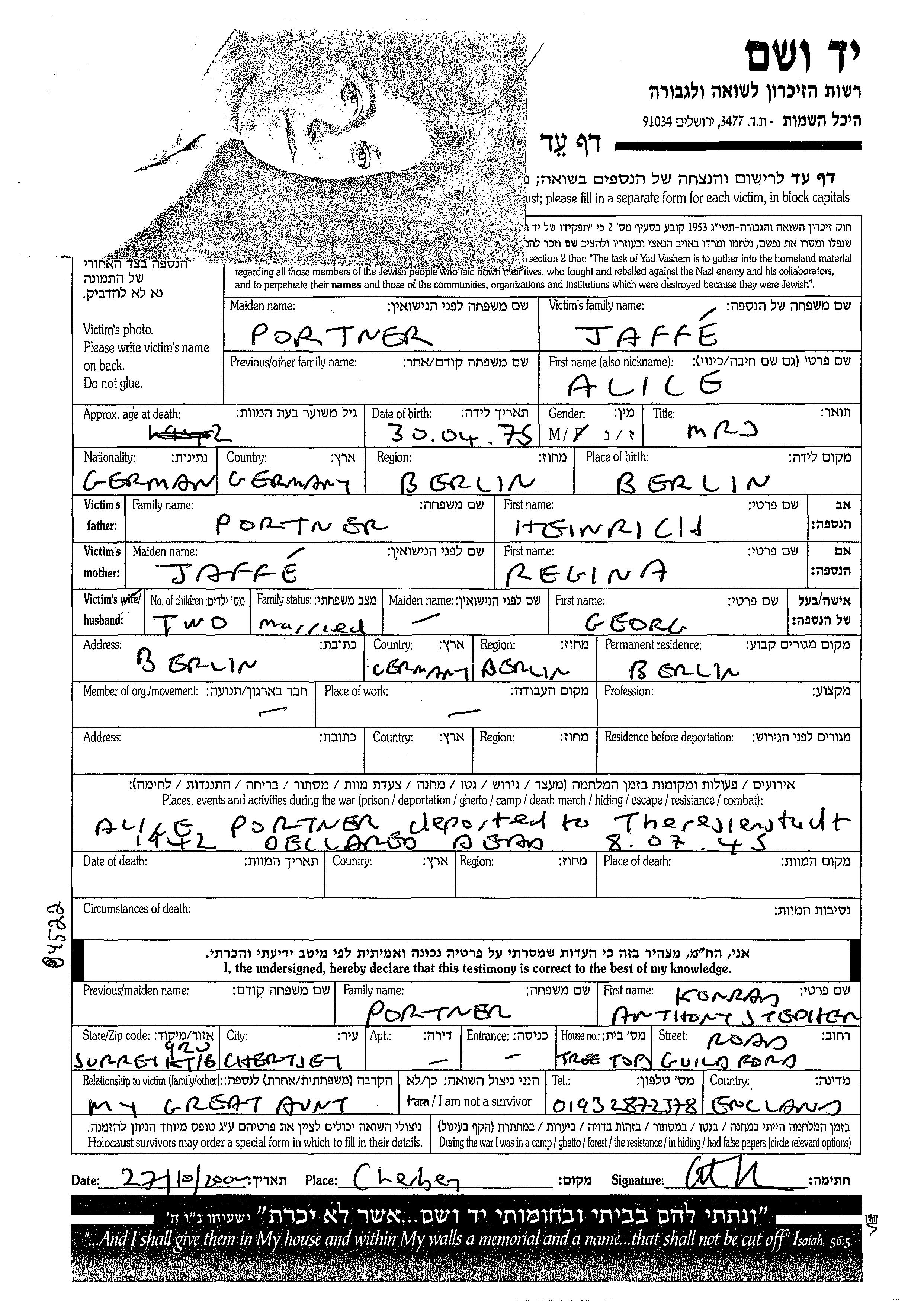Alice Jaffe née Portner est née à Berlin, Allemagne en 1875. Avant la seconde guerre mondiale elle vivait à Berlin, Allemagne.