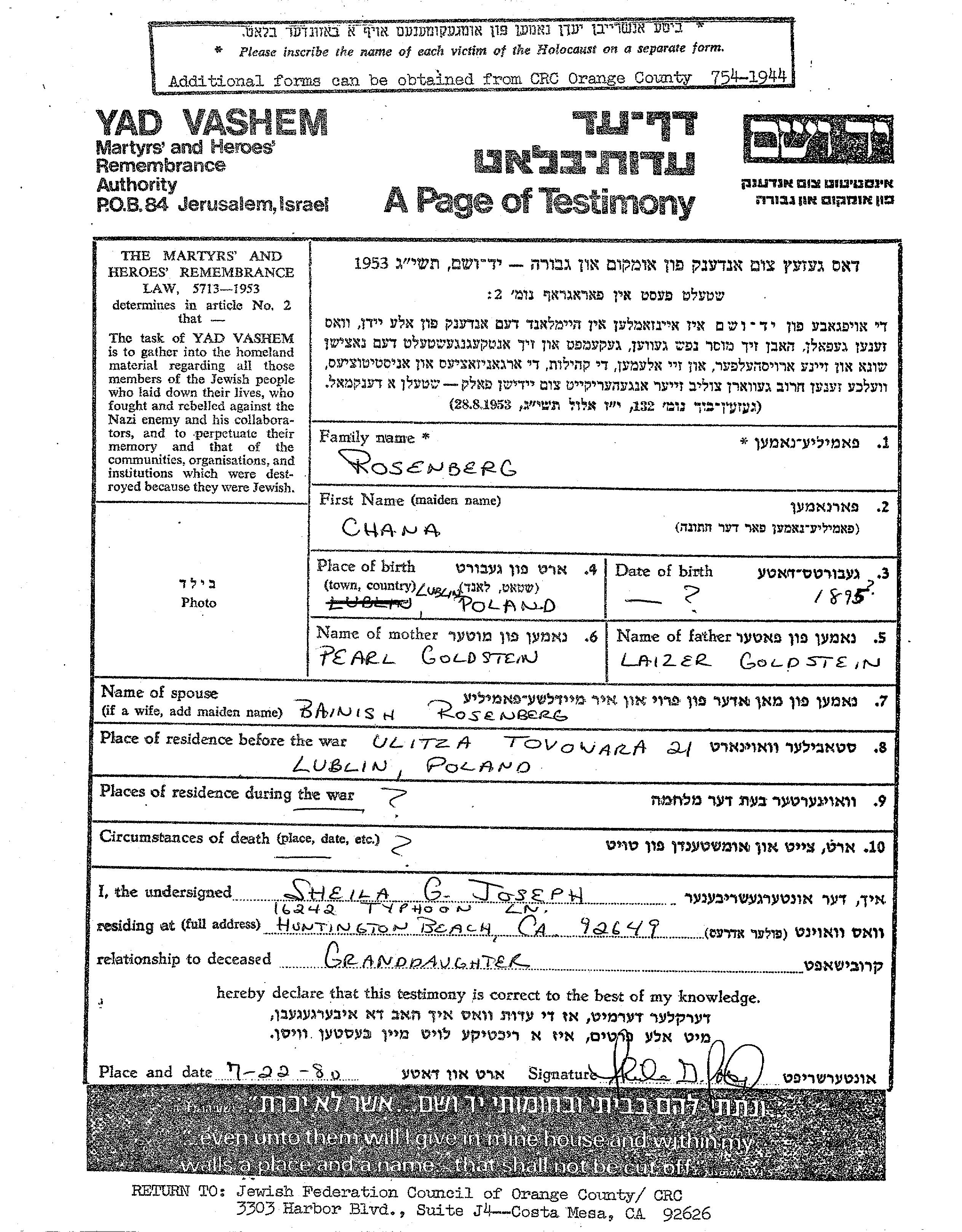 Rosenberg Chana 1895 Lublin, Pologne Feuille de témoignage