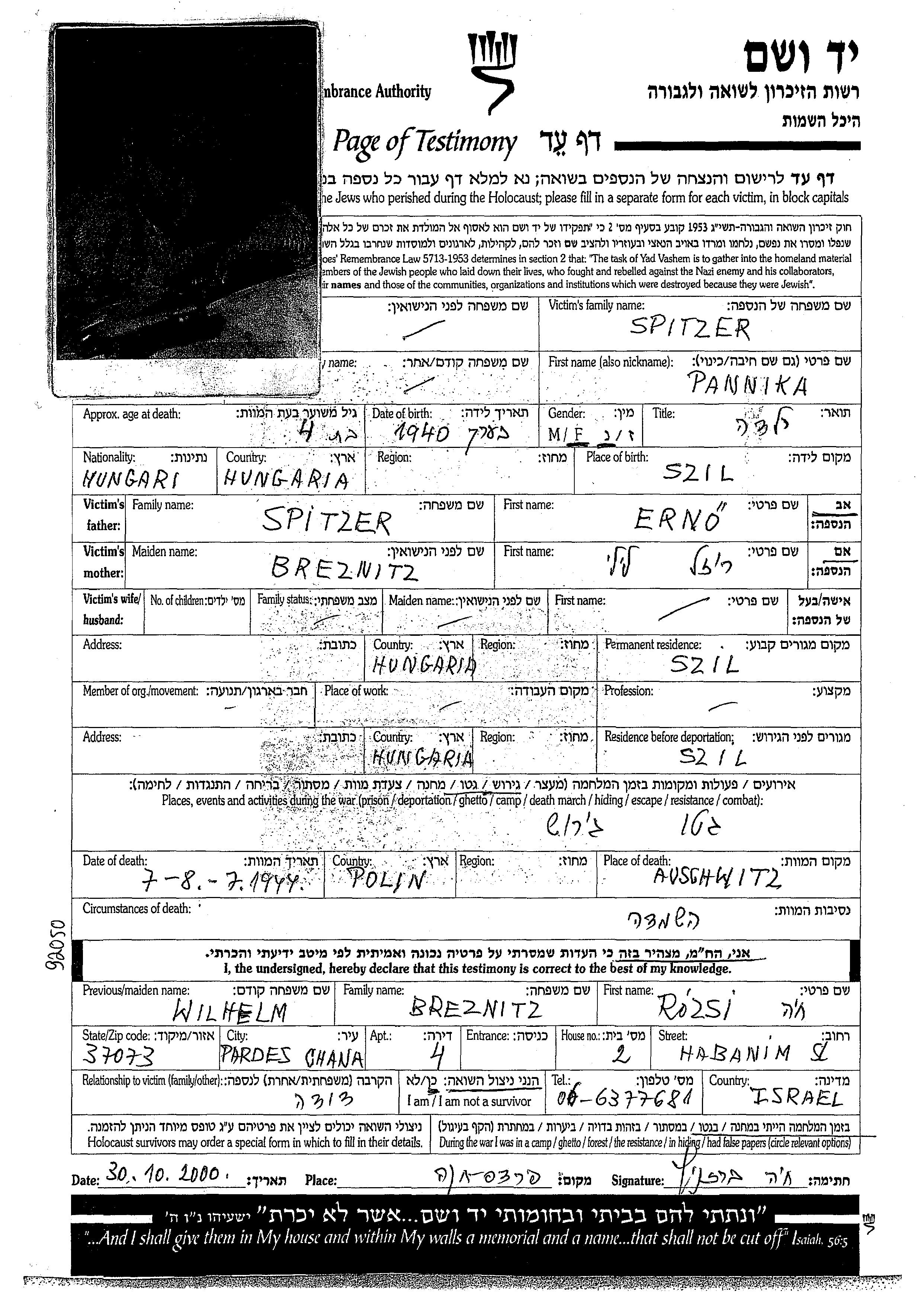 Pannika Spitzer est née à Szil, Hongrie en 1940. Avant la seconde guerre mondiale elle vivait à Szil, Hongrie.