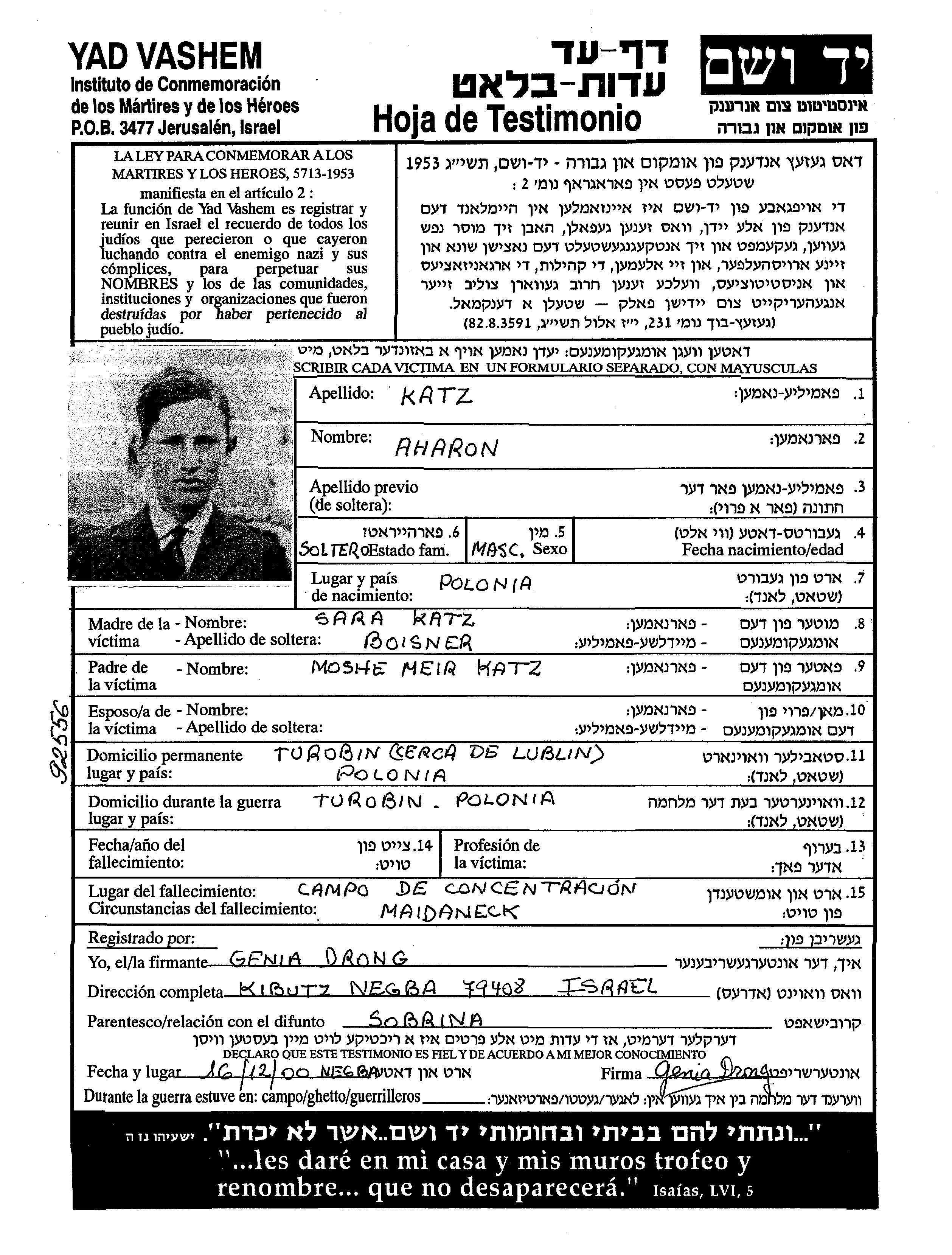 Katz Aharon Turobin, Pologne Feuille de témoignage