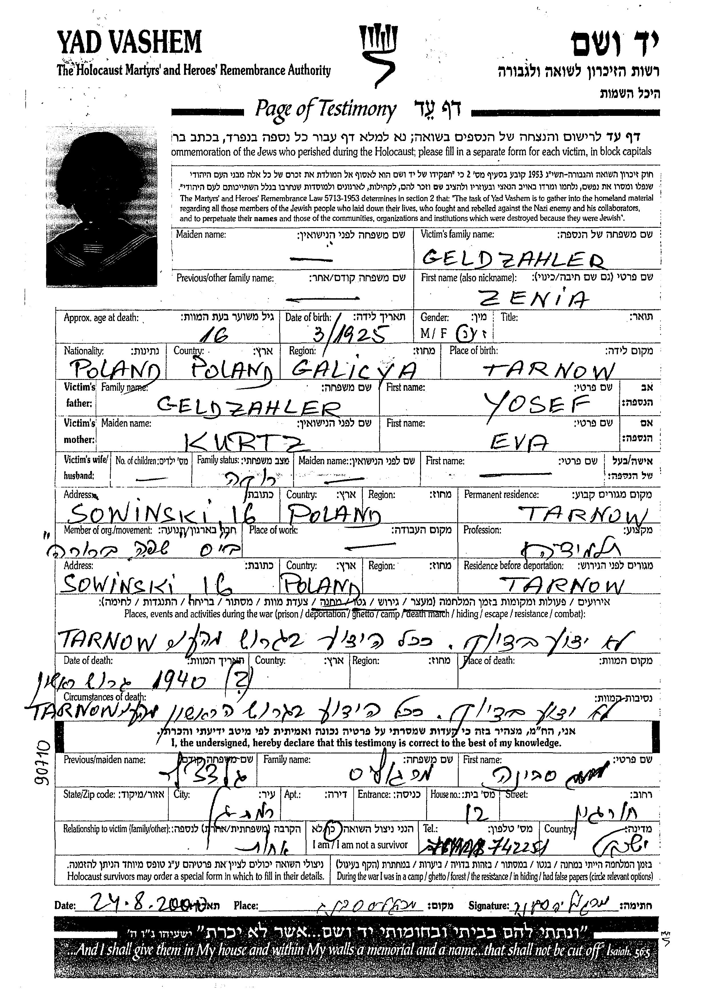 Geldzahler Zenia 1925 Tarnow, Pologne Feuille de témoignage