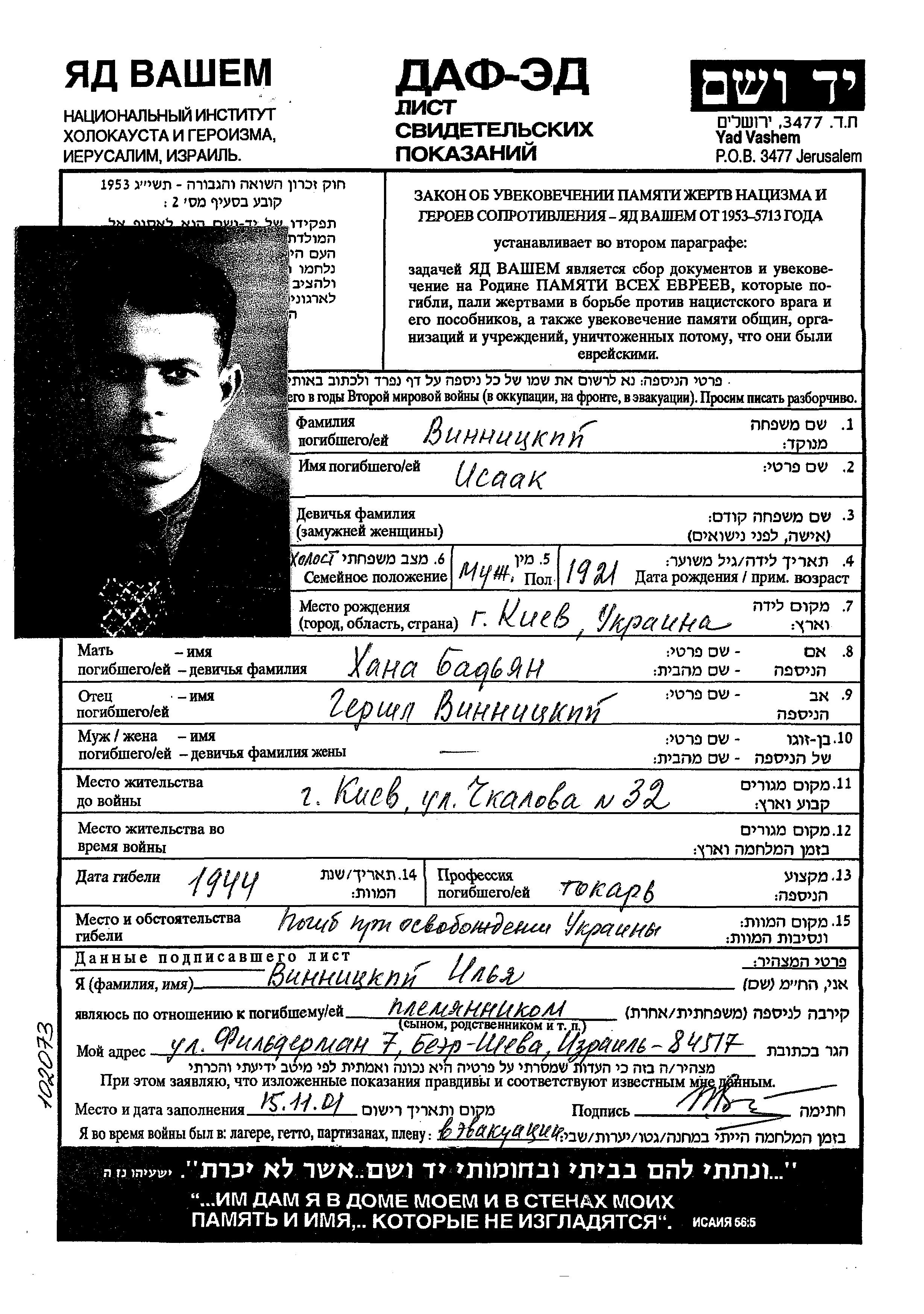 Isaak Vinnitzki est né à Kiev, Ukraine (URSS) en 1921. Il était Tourneur. Avant la seconde guerre mondiale il vivait à Kiev, Ukraine (URSS). Isaak a été tué en tant que militaire pendant la Seconde Guerre mondiale. Lieu de la mort: Ukraine (URSS) en 1944.