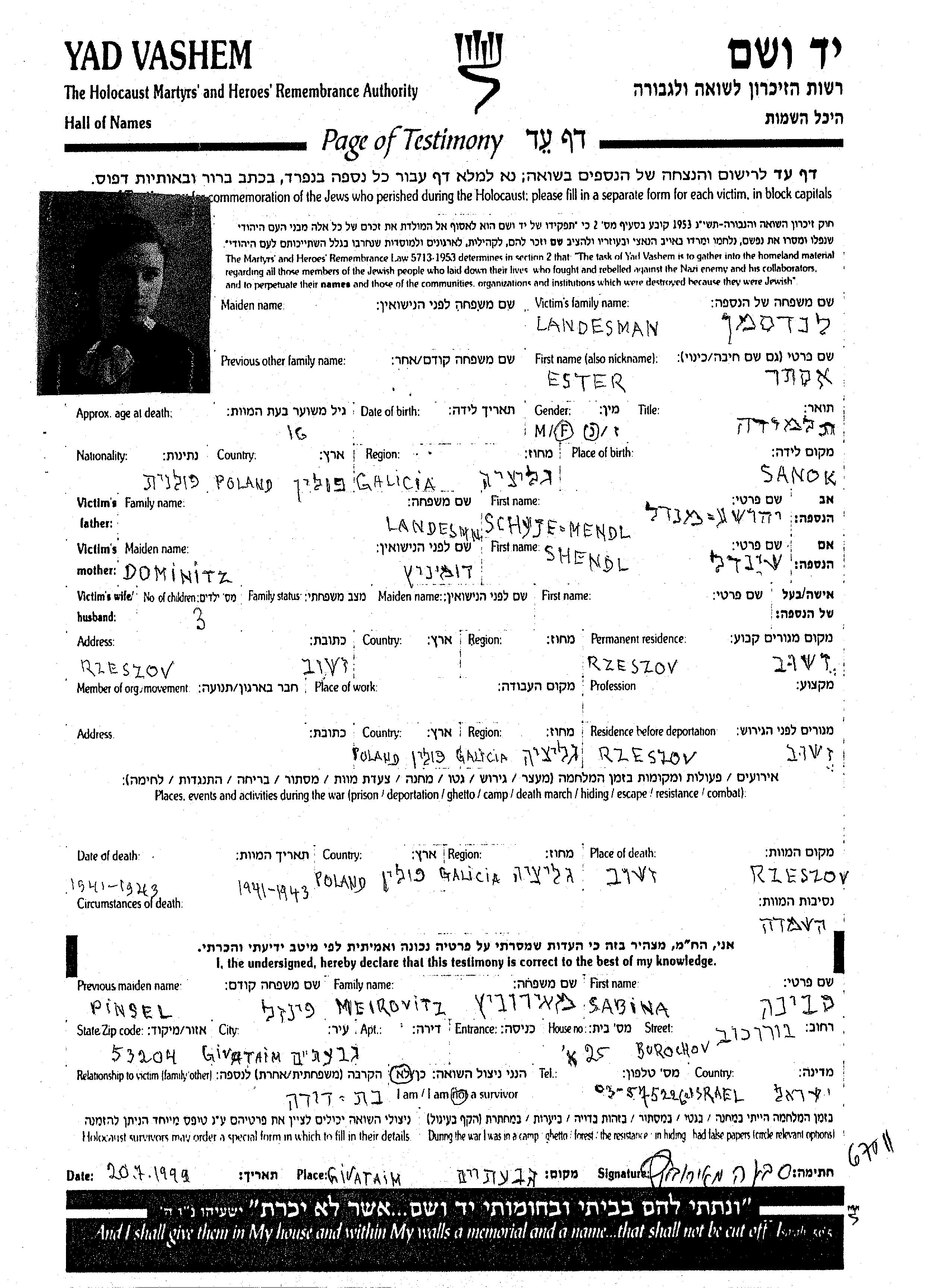 Ester a été assassinée pendant la Shoah. Lieu de la mort: Rzeszow, Pologne en 1941.