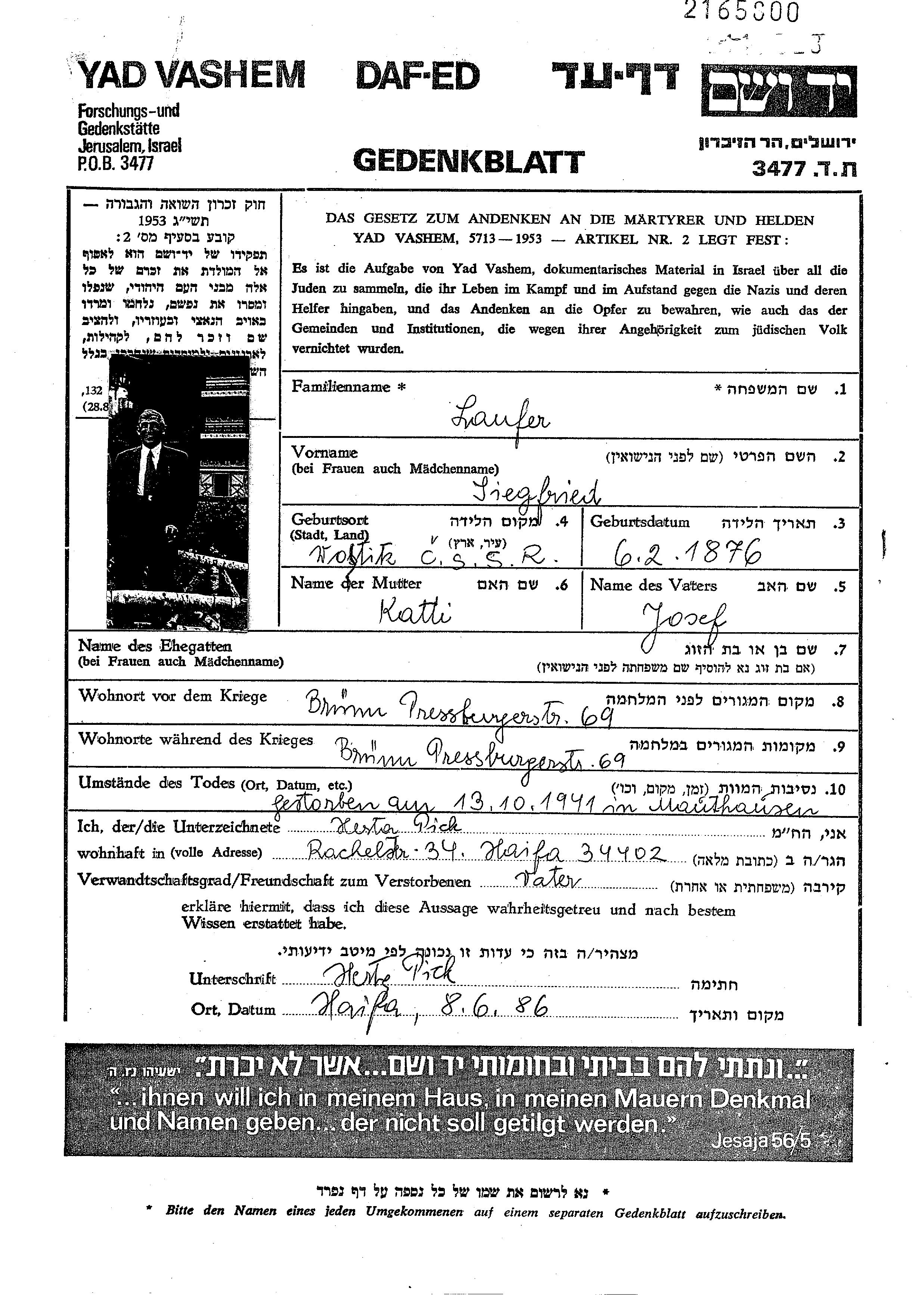 Laufer Siegfried 1876 Bruenn, Tchécoslovaquie Feuille de témoignage