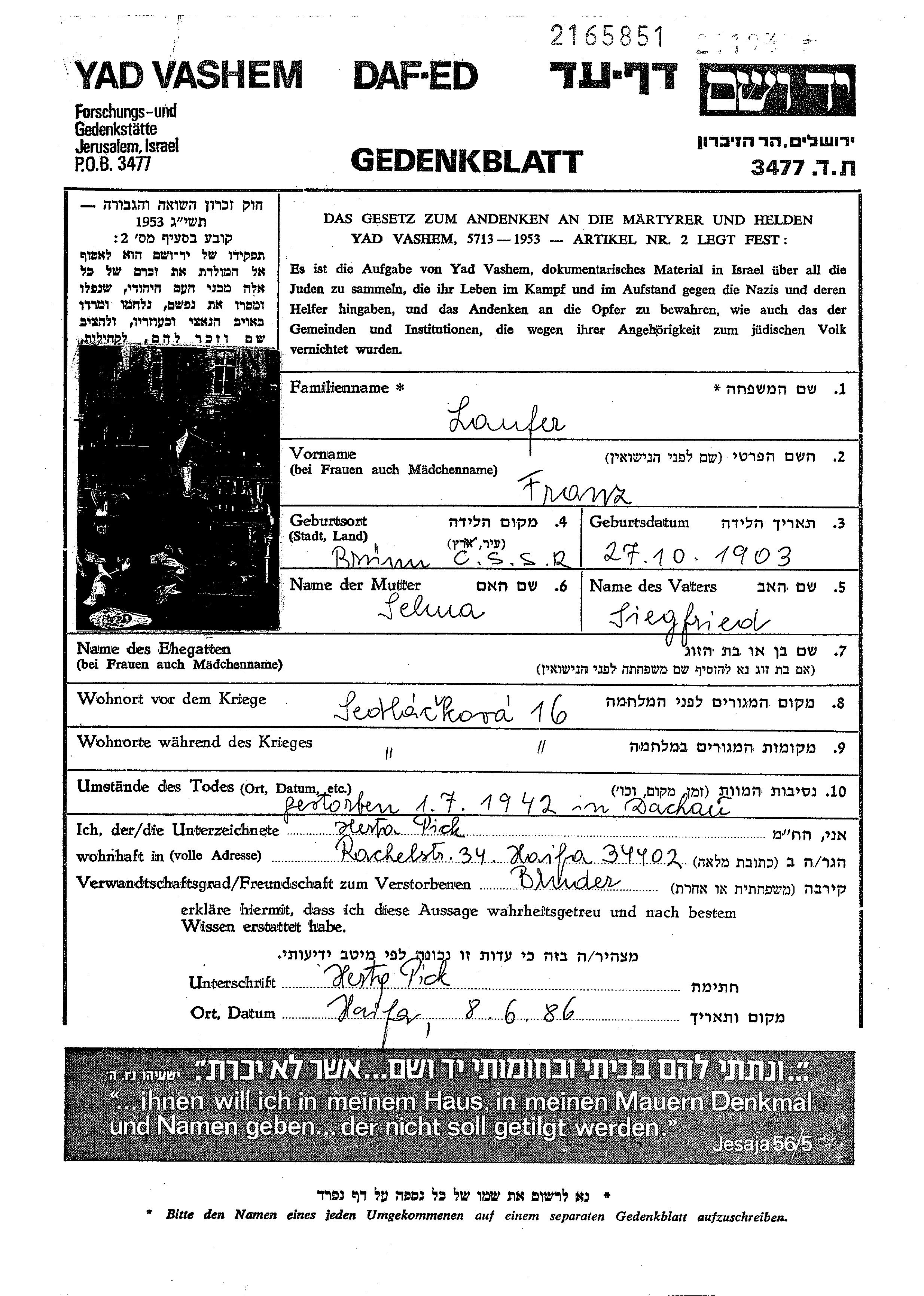 Laufer | Franz | 1903 | Bruenn, Tchécoslovaquie | Liste de personnes persécutées |