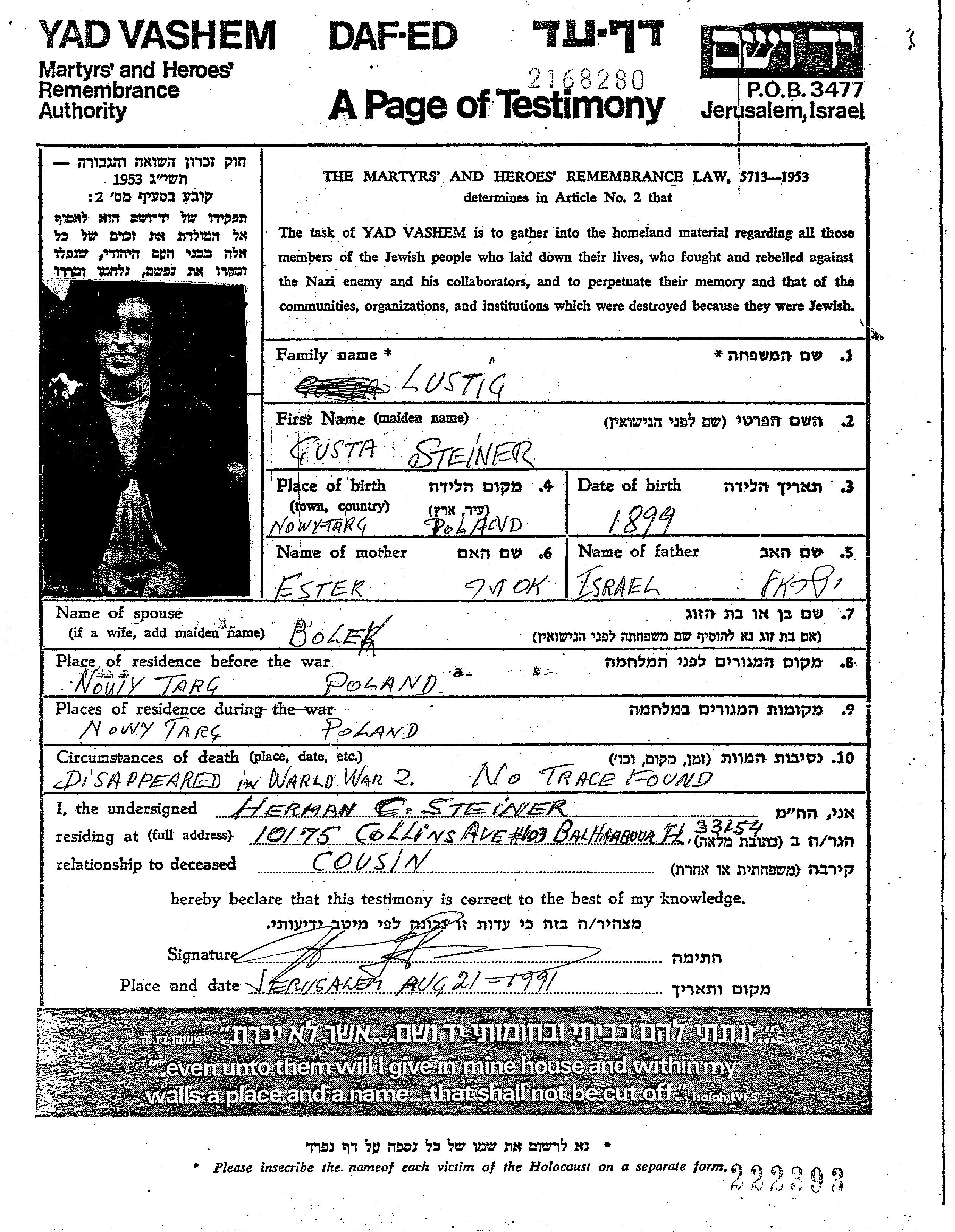 Gusta Lustig née Steiner est née à Nowy Targ, Pologne en 1899. Avant la seconde guerre mondiale elle vivait à Nowy Targ, Pologne.