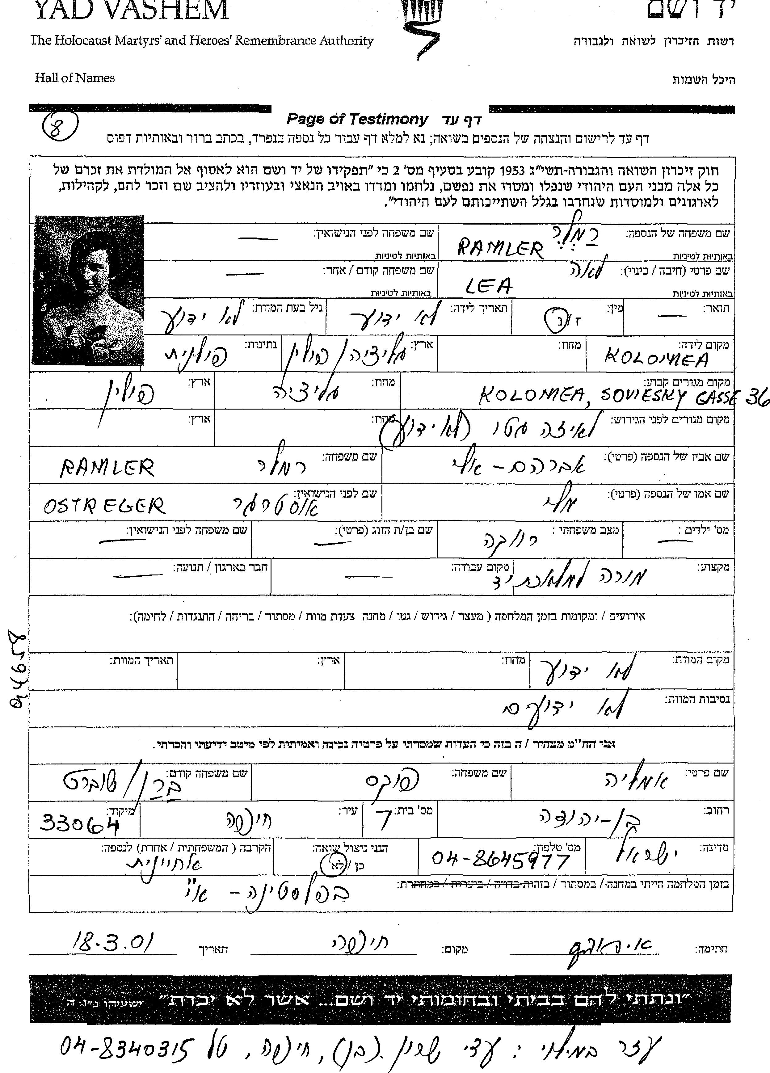 Ramler Lea Kolomea, Pologne Feuille de témoignage