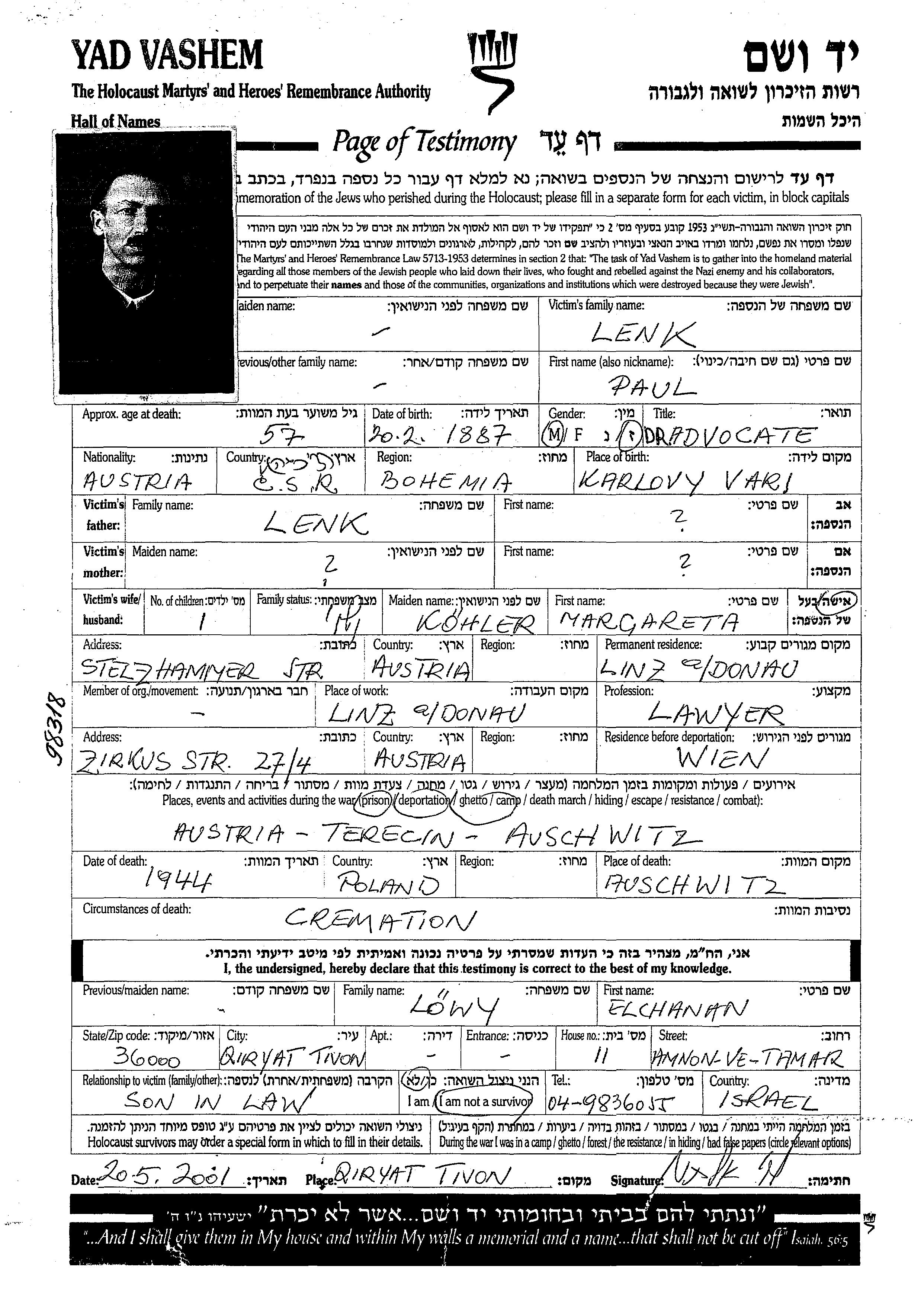 Yad Vashem - Pages of Testimony Names Memorial Collection