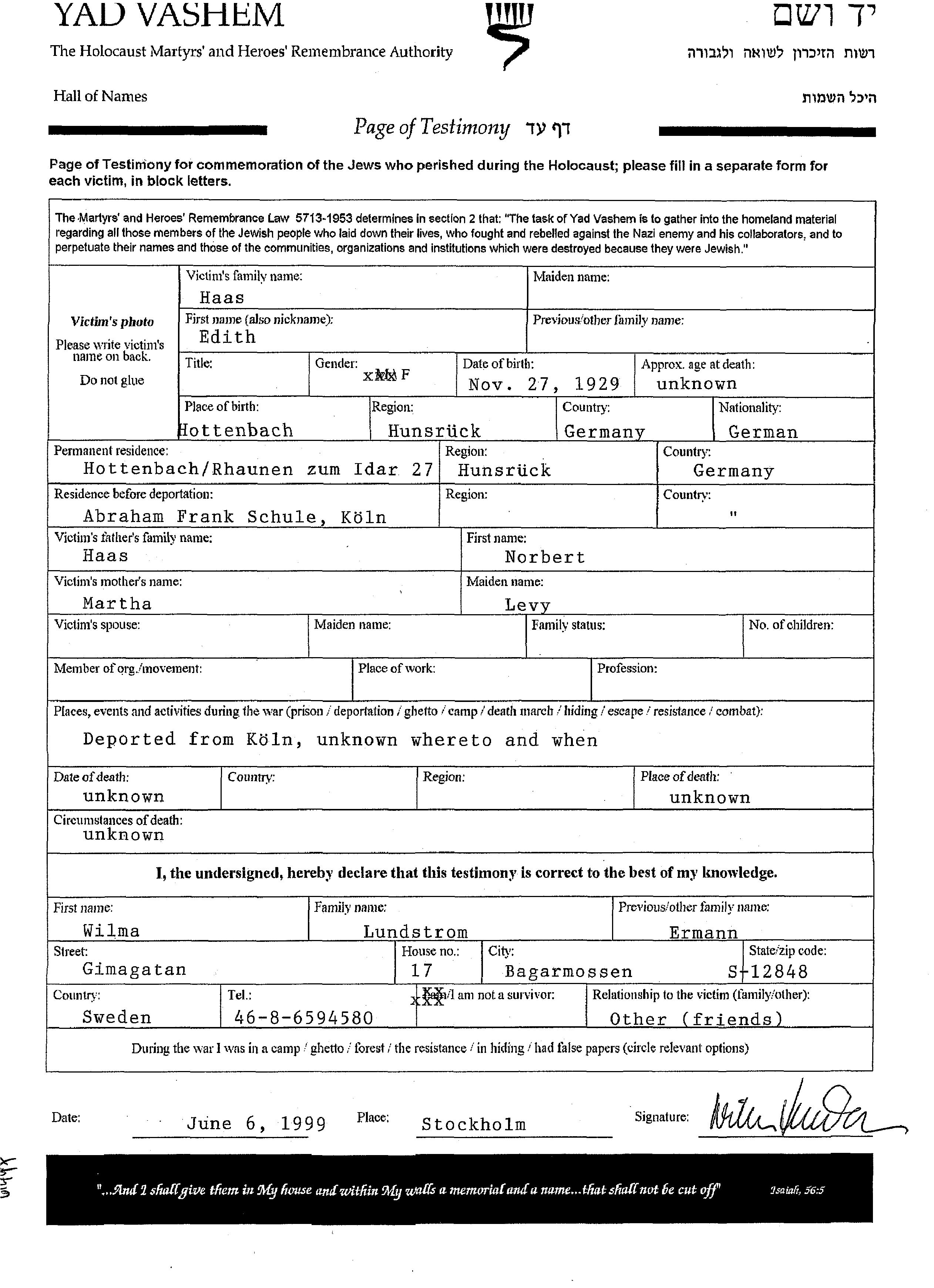 Haas Edith 1929 Hottenbach, Allemagne Feuille de témoignage