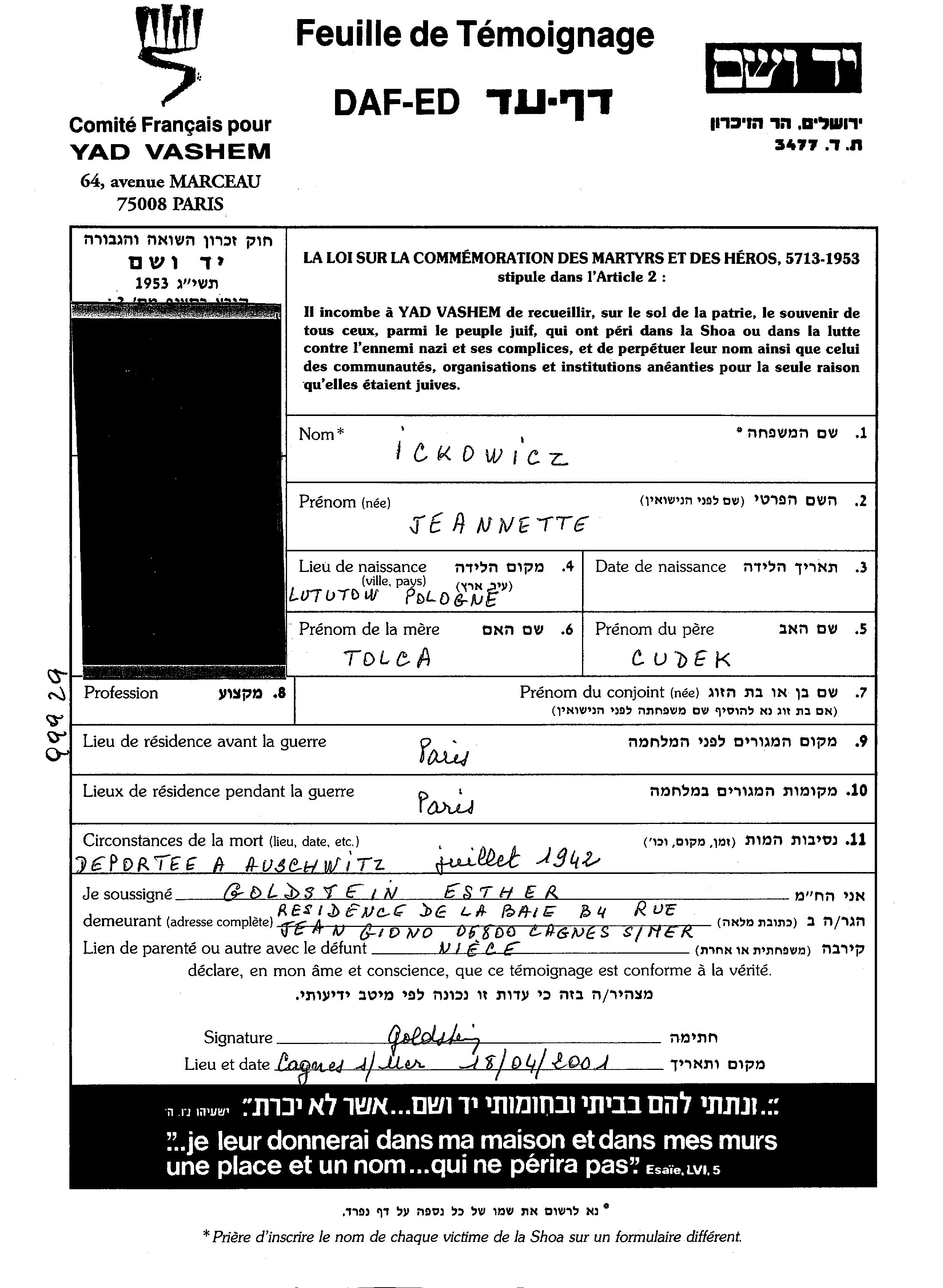 Ickowicz Jeannette Paris, France Feuille de témoignage