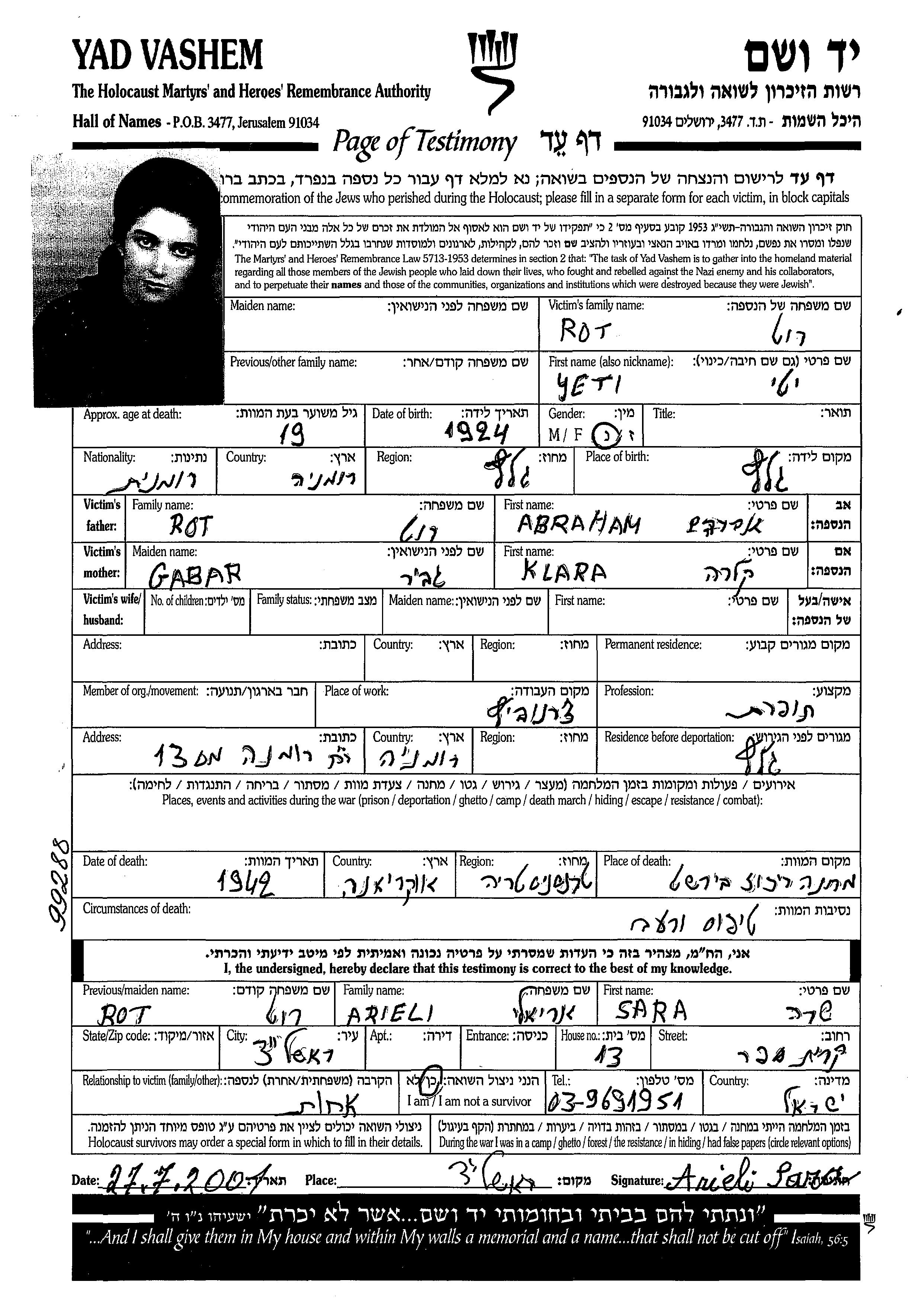 Yad Vashem - Pages of Testimony Names Memorial Collection