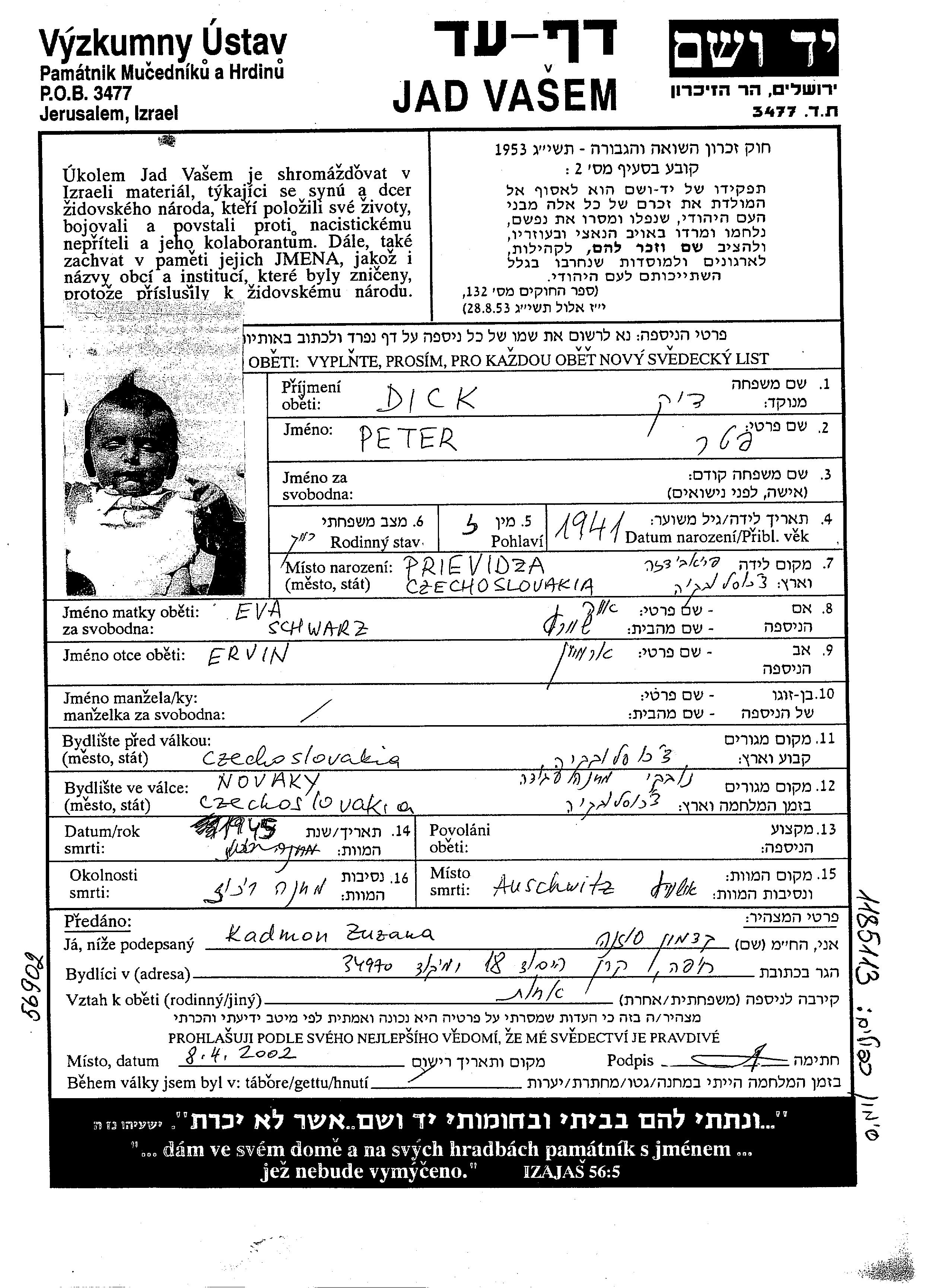 Dick Peter 1941 Tchécoslovaquie Feuille de témoignage