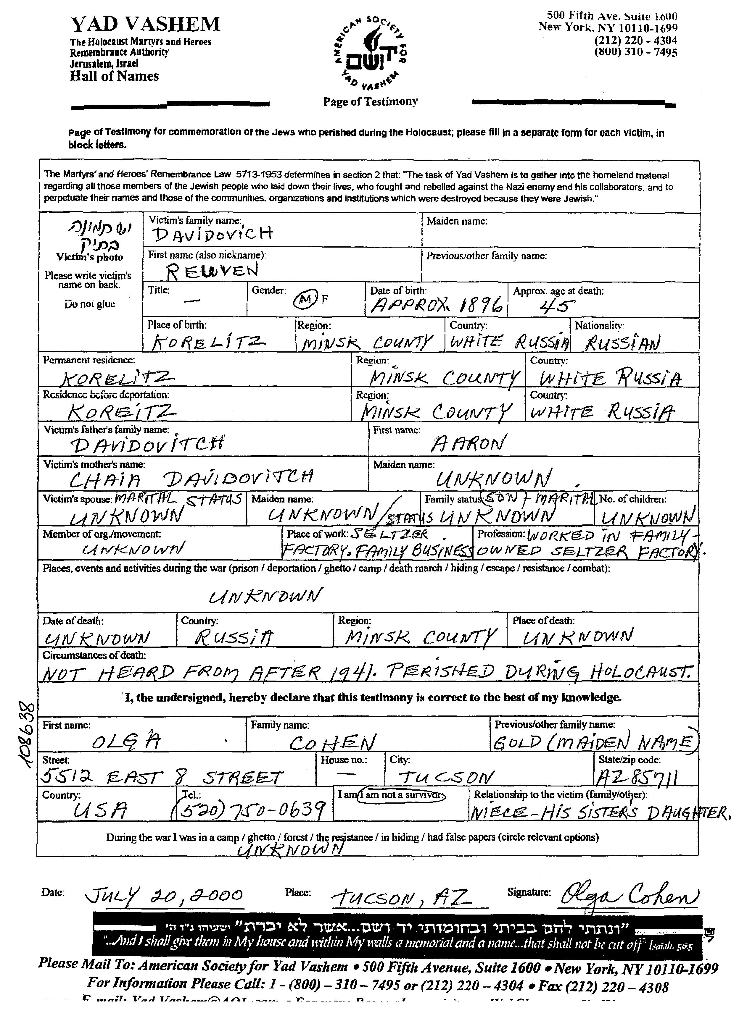 Davidovich Reuven 1896 Korelitz, Pologne Feuille de témoignage