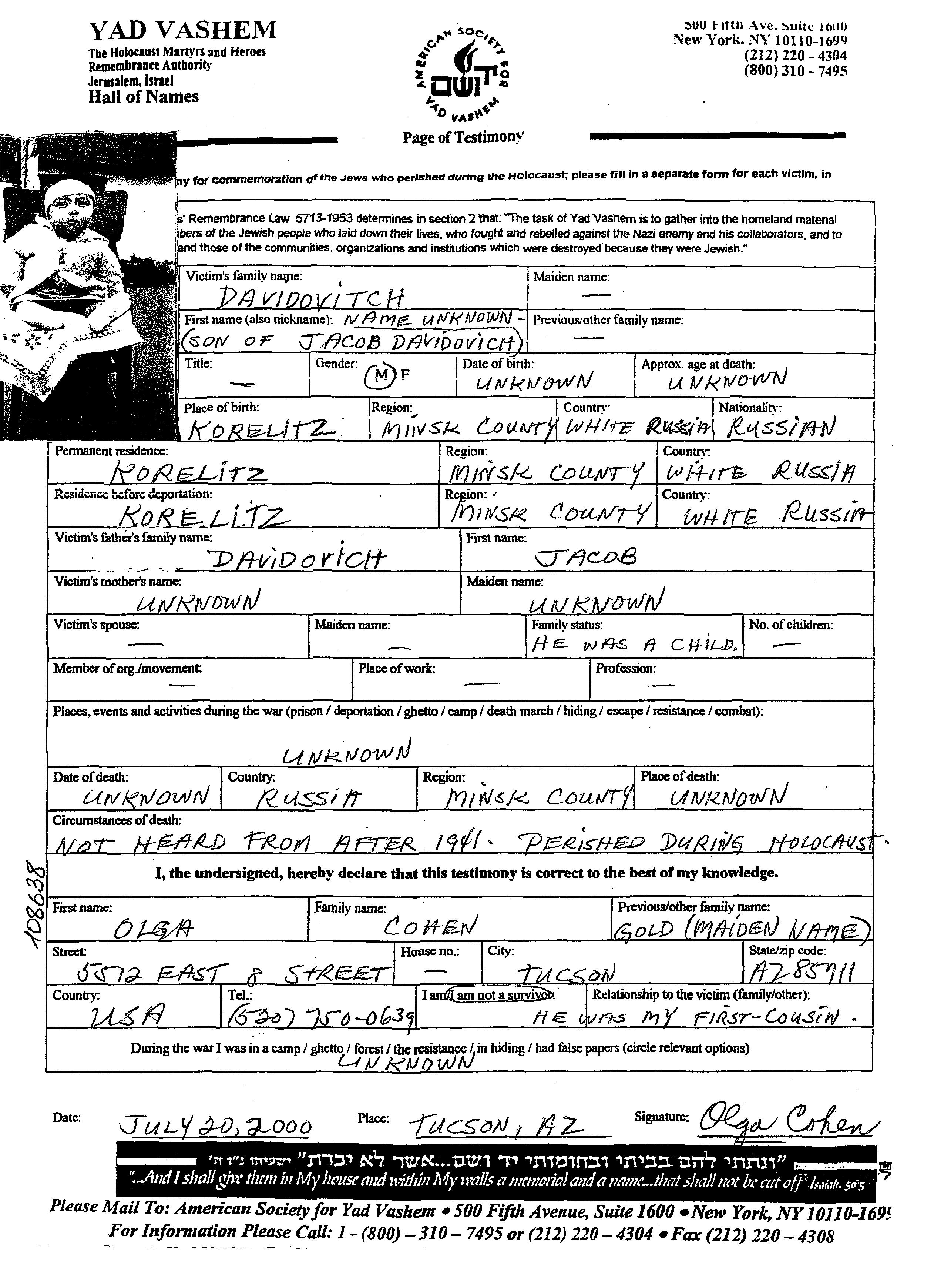 Davidovitch prénom inconnu Korelitz, Pologne Feuille de témoignage