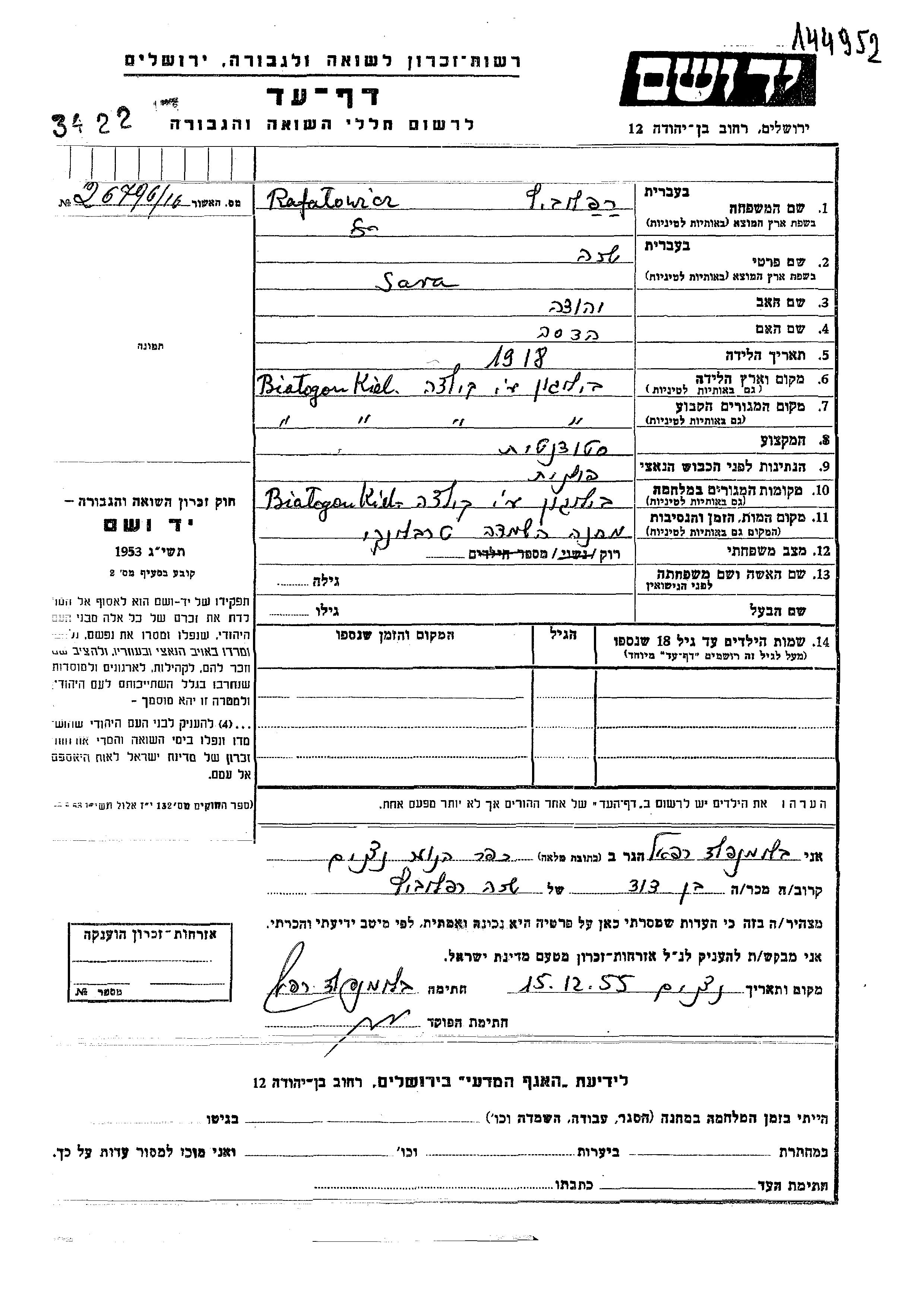 Rafalowicz Sara 1918 Bialogon, Pologne Feuille de témoignage