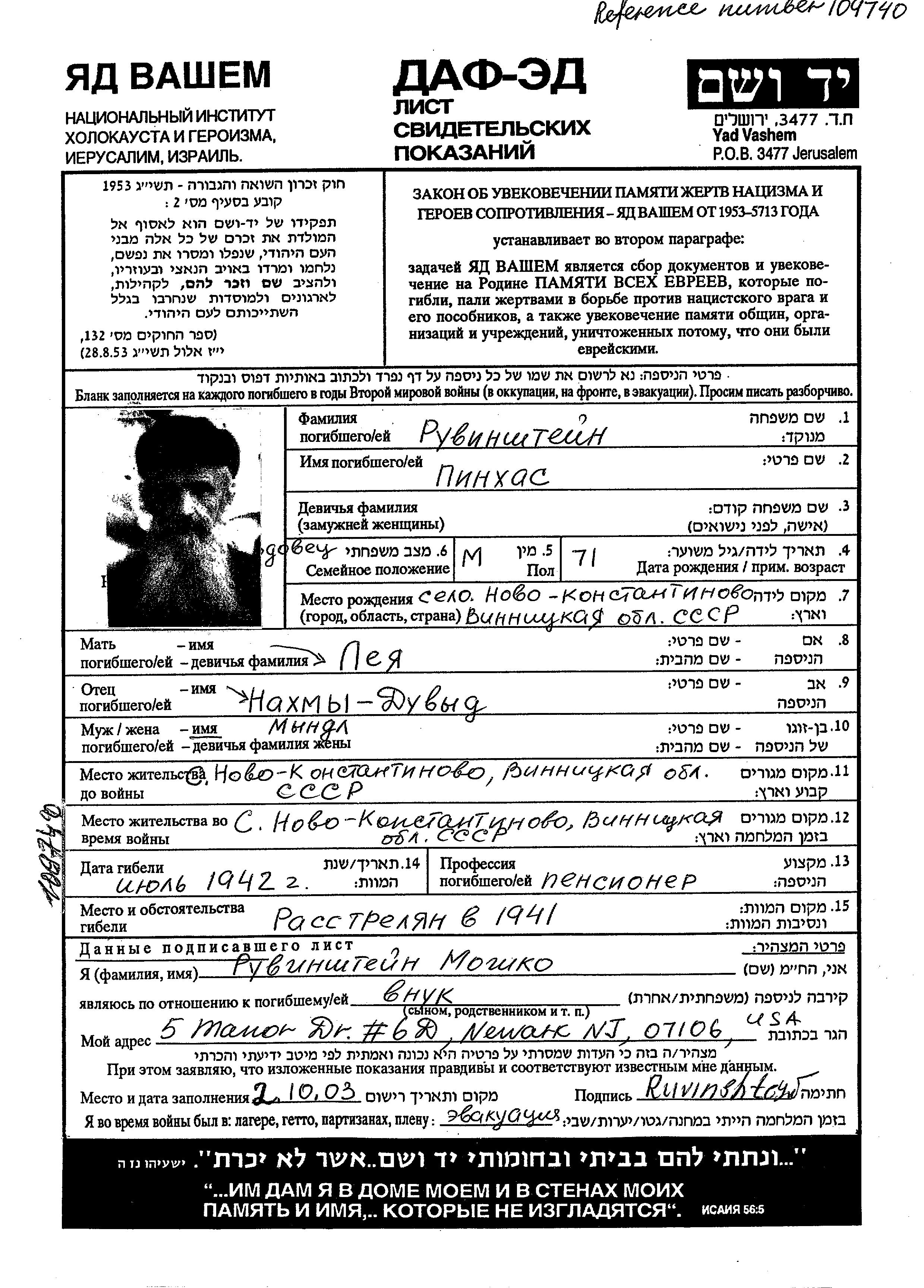 Ruvinshtein | Pinkhas | 1870 | Novokonstantinov, Ukraine (URSS) | Feuille de témoignage |