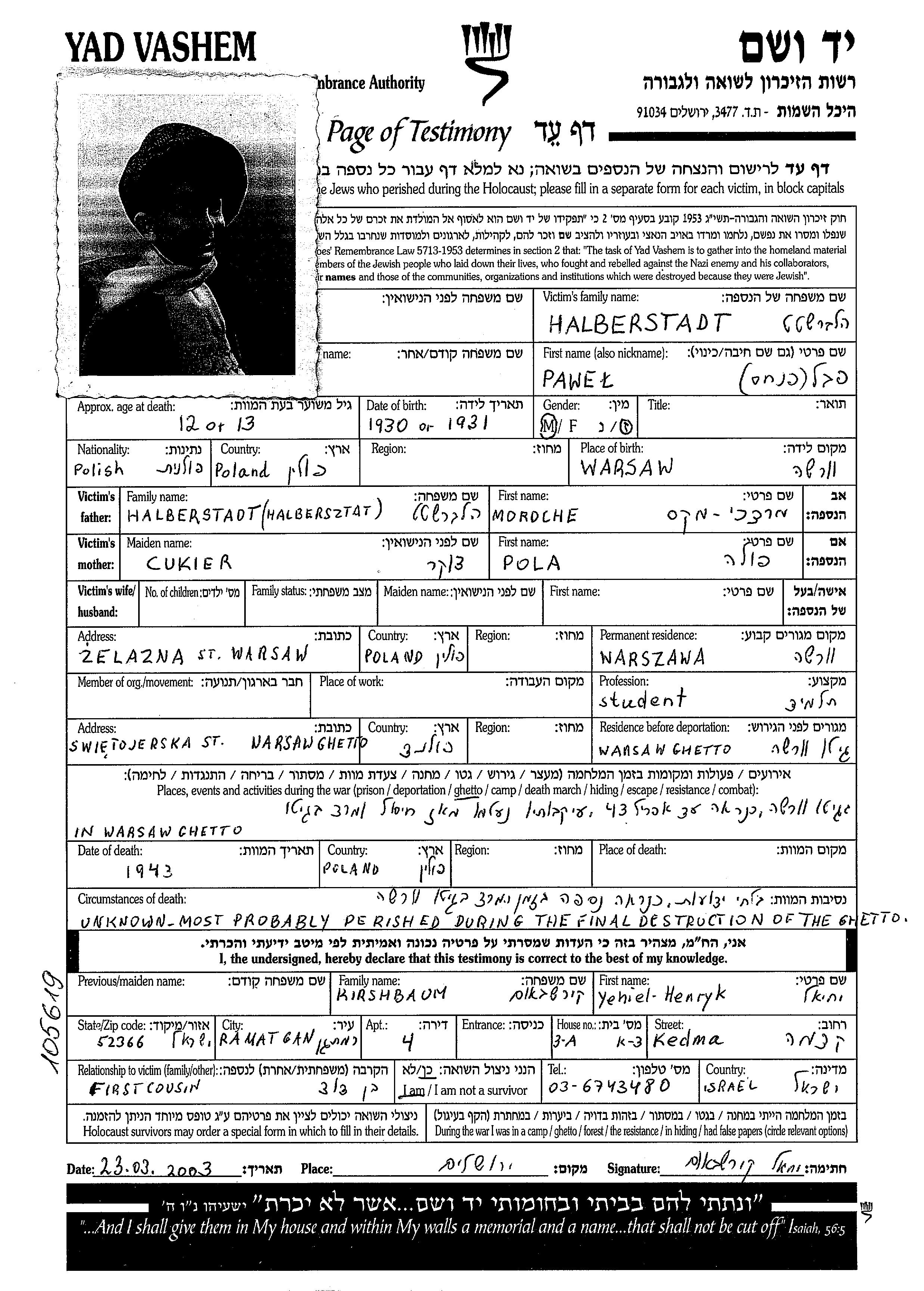 Pawel Pinkhas Halberstadt est né à Warszawa, Pologne en 1930. Il était Élève. Avant la seconde guerre mondiale il vivait à Warszawa, Pologne.