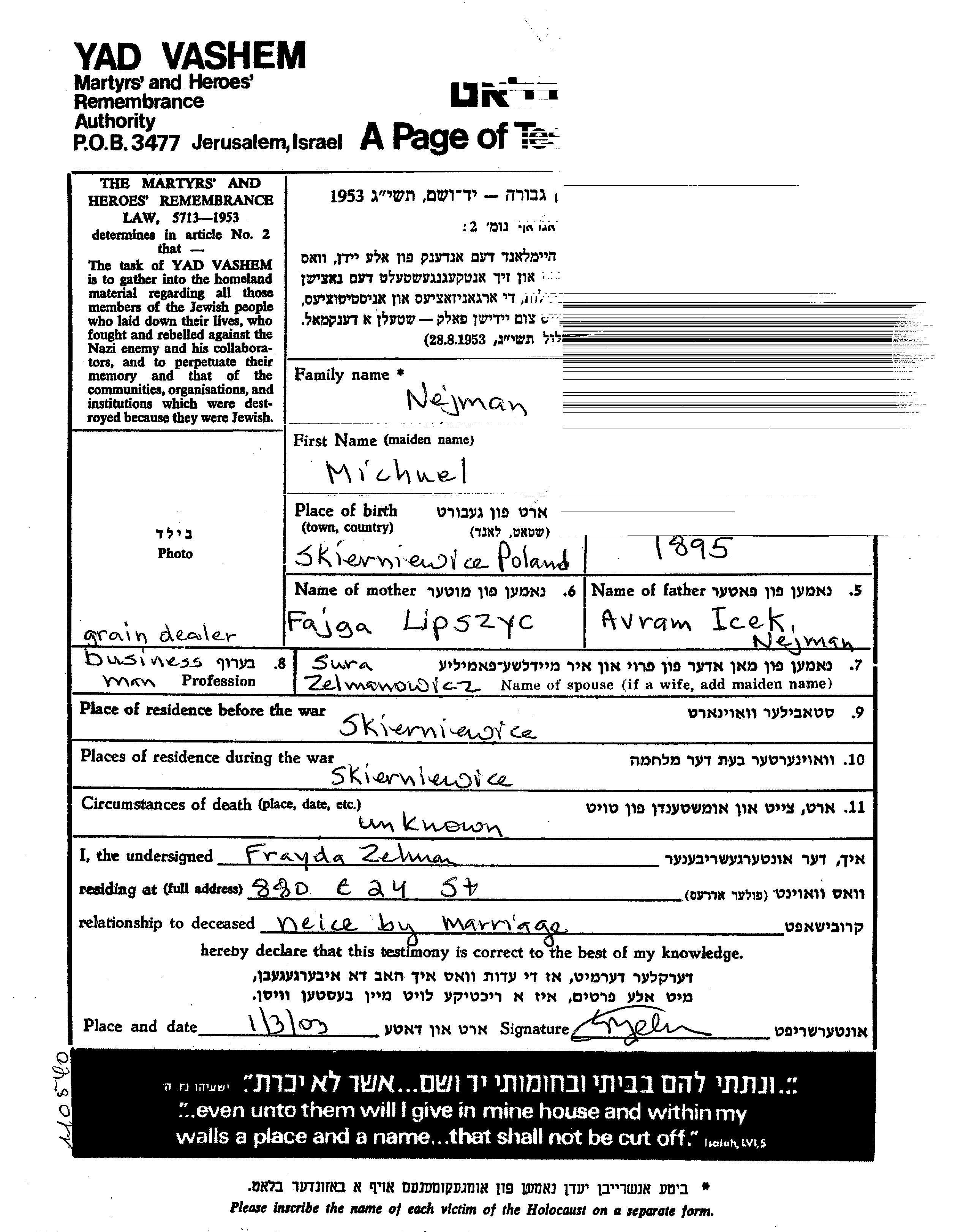 Nejman Michuel 1895 Skierniewice, Pologne Feuille de témoignage