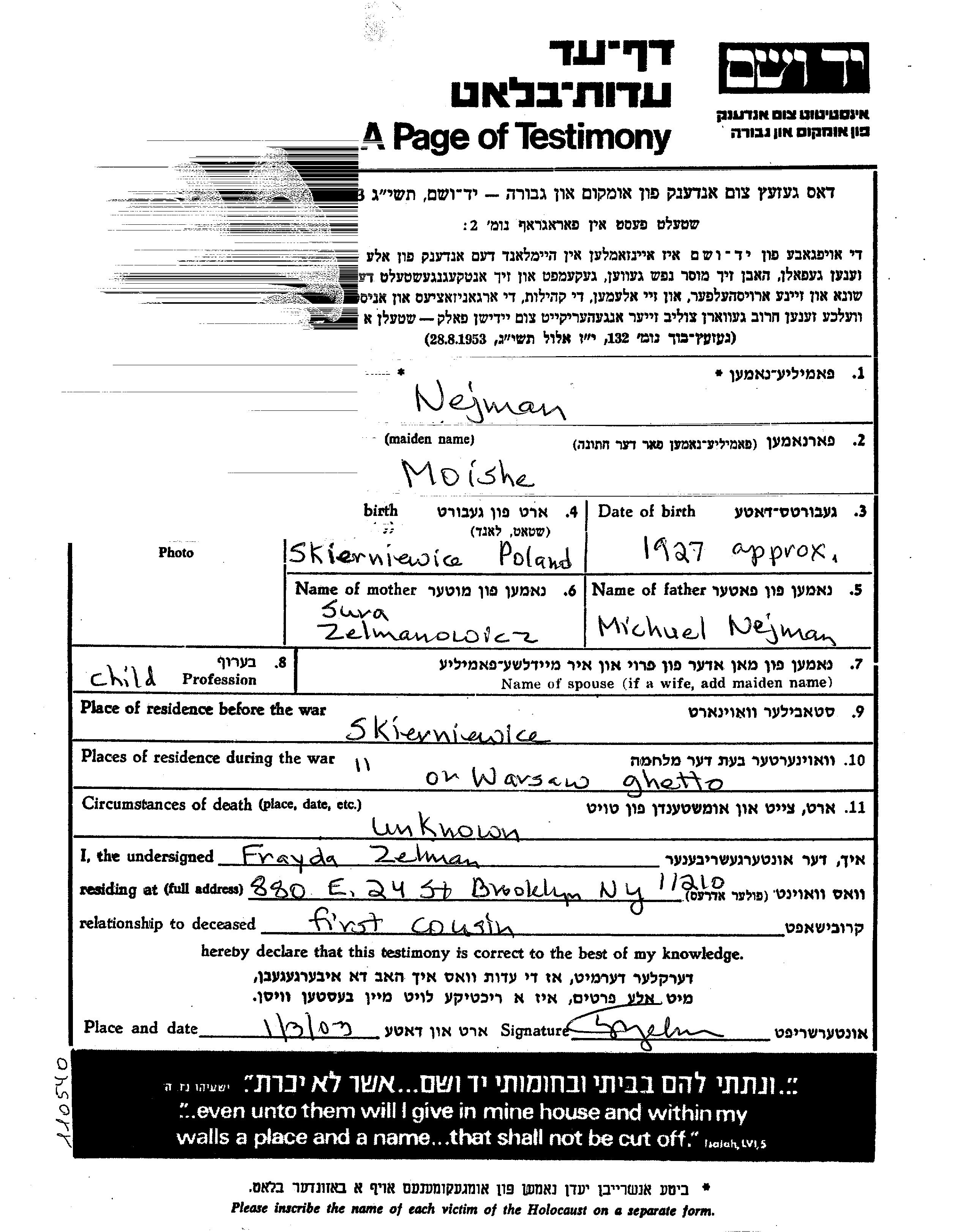 Nejman Moishe 1927 Skierniewice, Pologne Feuille de témoignage