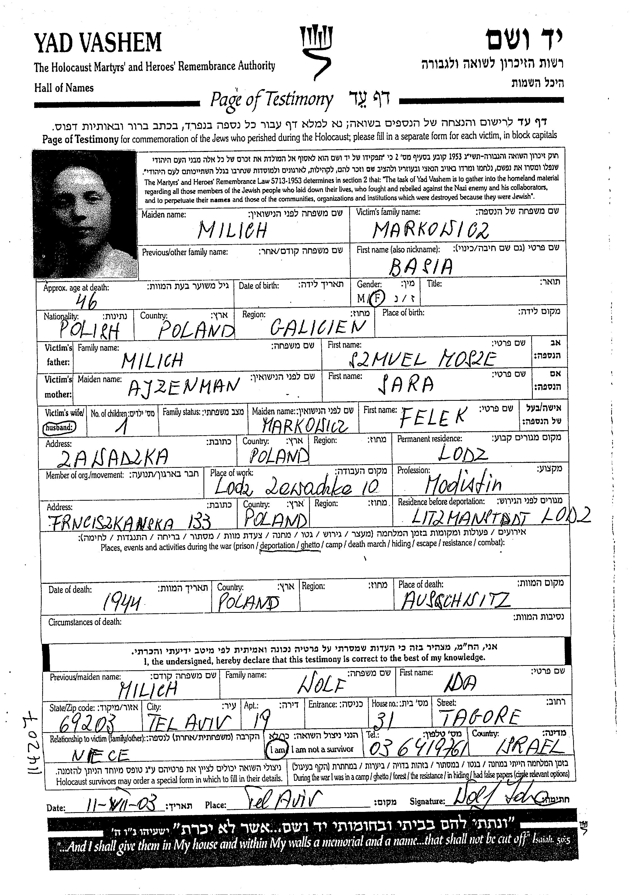 Markowicz Basia 1898 Lodz, Pologne Feuille de témoignage