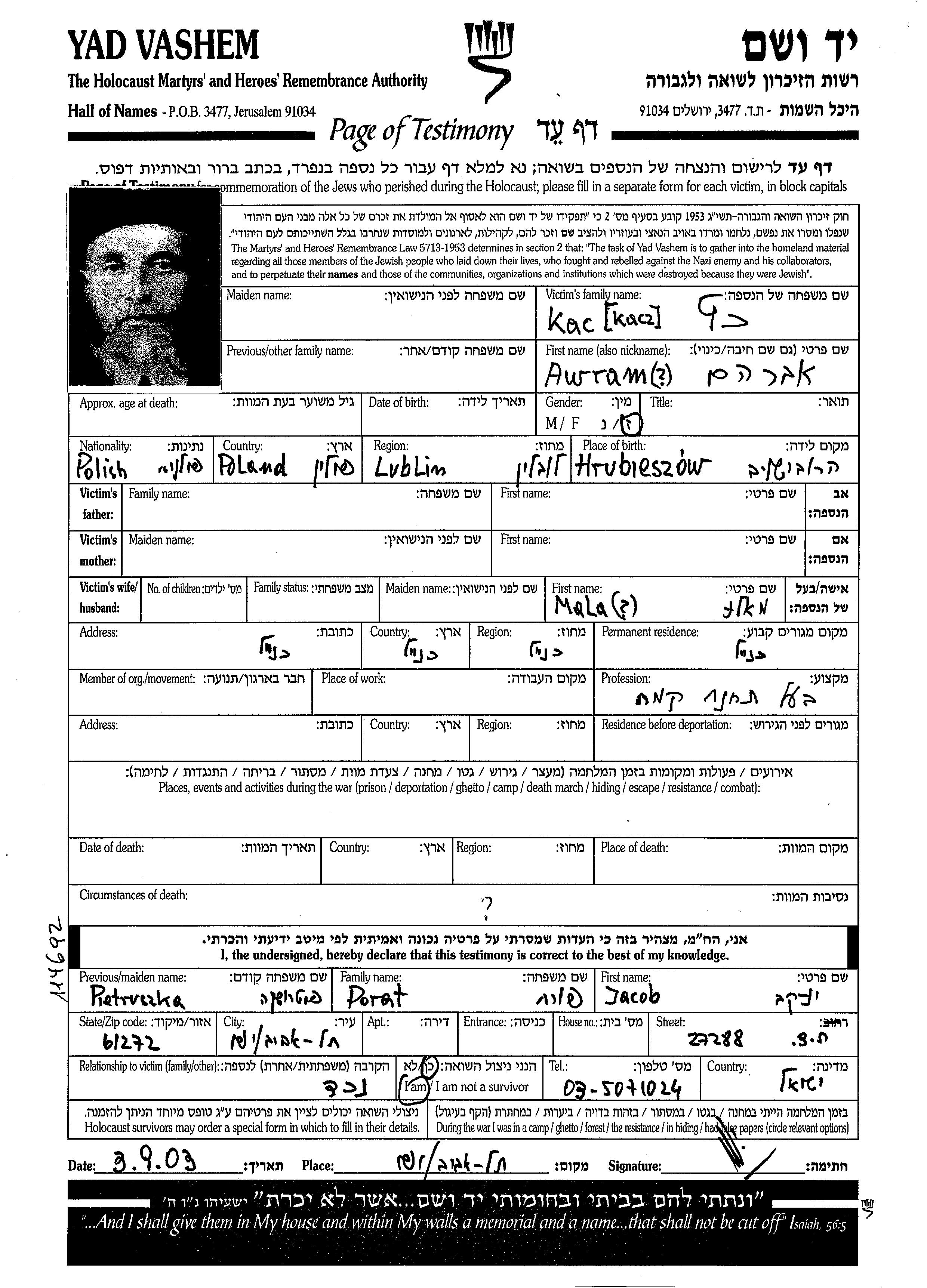 Awram a été assassiné pendant la Shoah. Lieu de la mort: endroit inconnu.