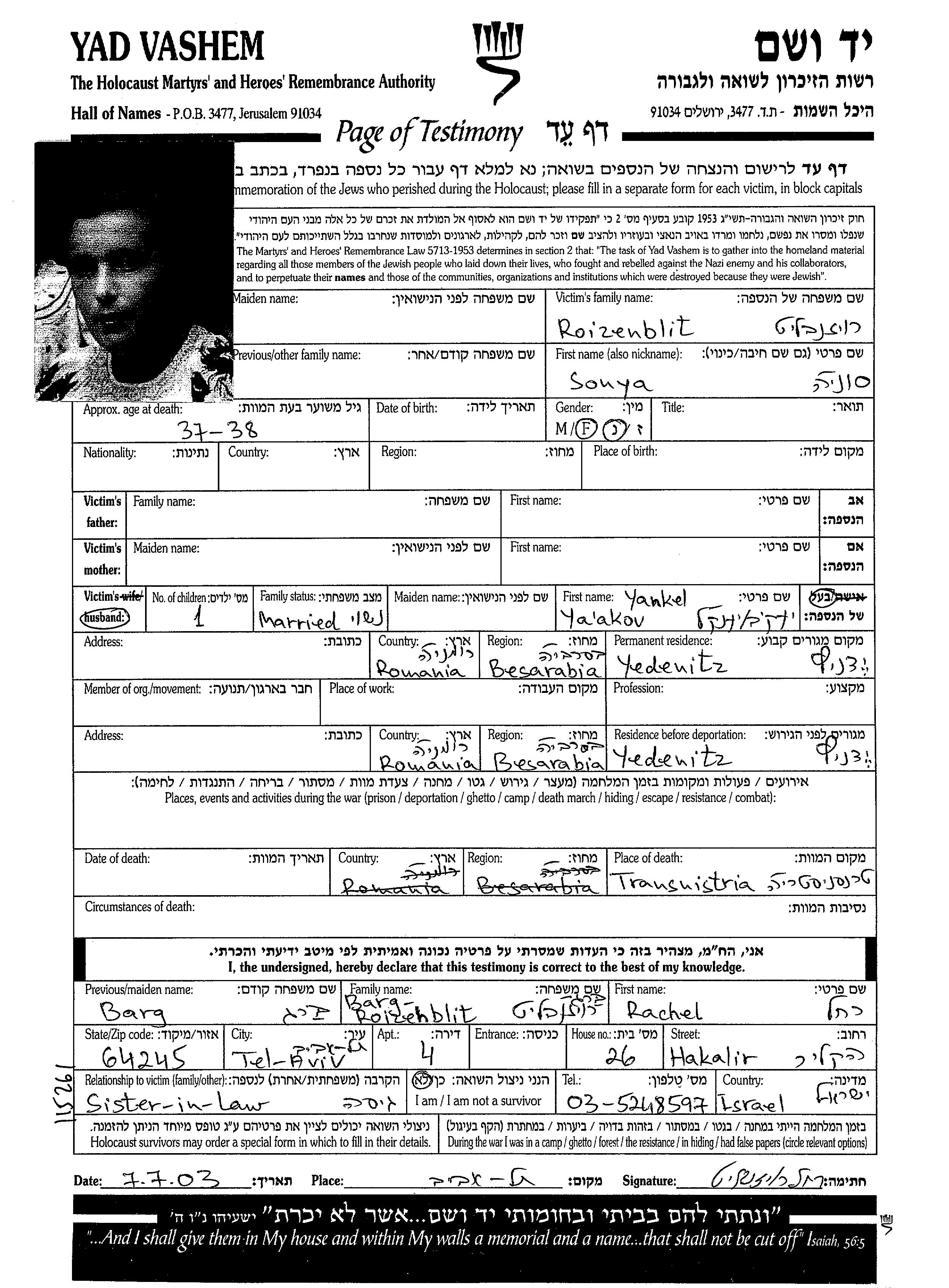 | Roizenblit | Sonya | Yedenitz, Roumanie | Feuille de témoignage | |