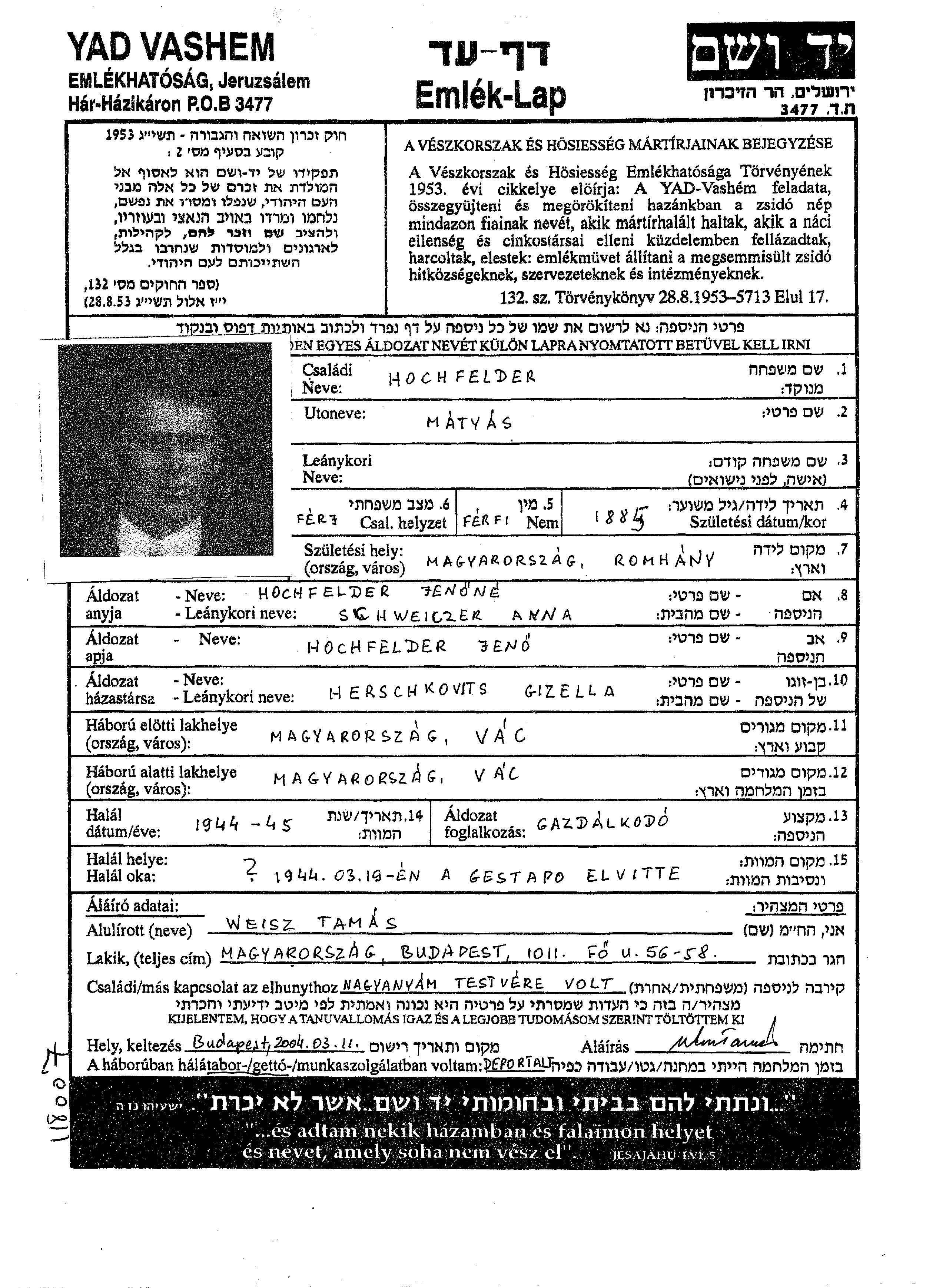 Matyas Hochfelder est né à Romhany, Hongrie en 1885. Il était Agriculteur. Avant la seconde guerre mondiale il vivait à Vac, Hongrie.