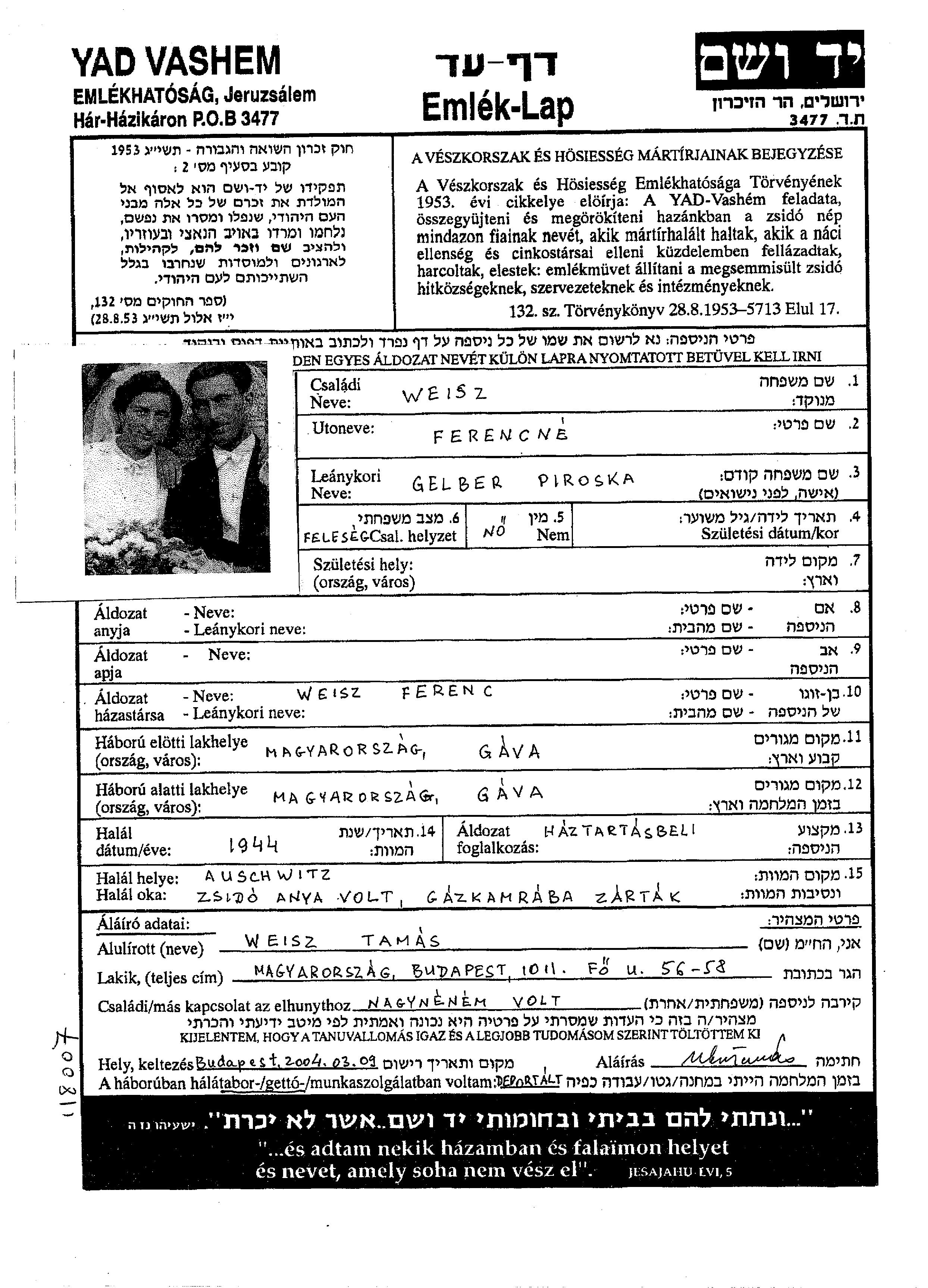 Weisz Piroska Gava, Hongrie Feuille de témoignage