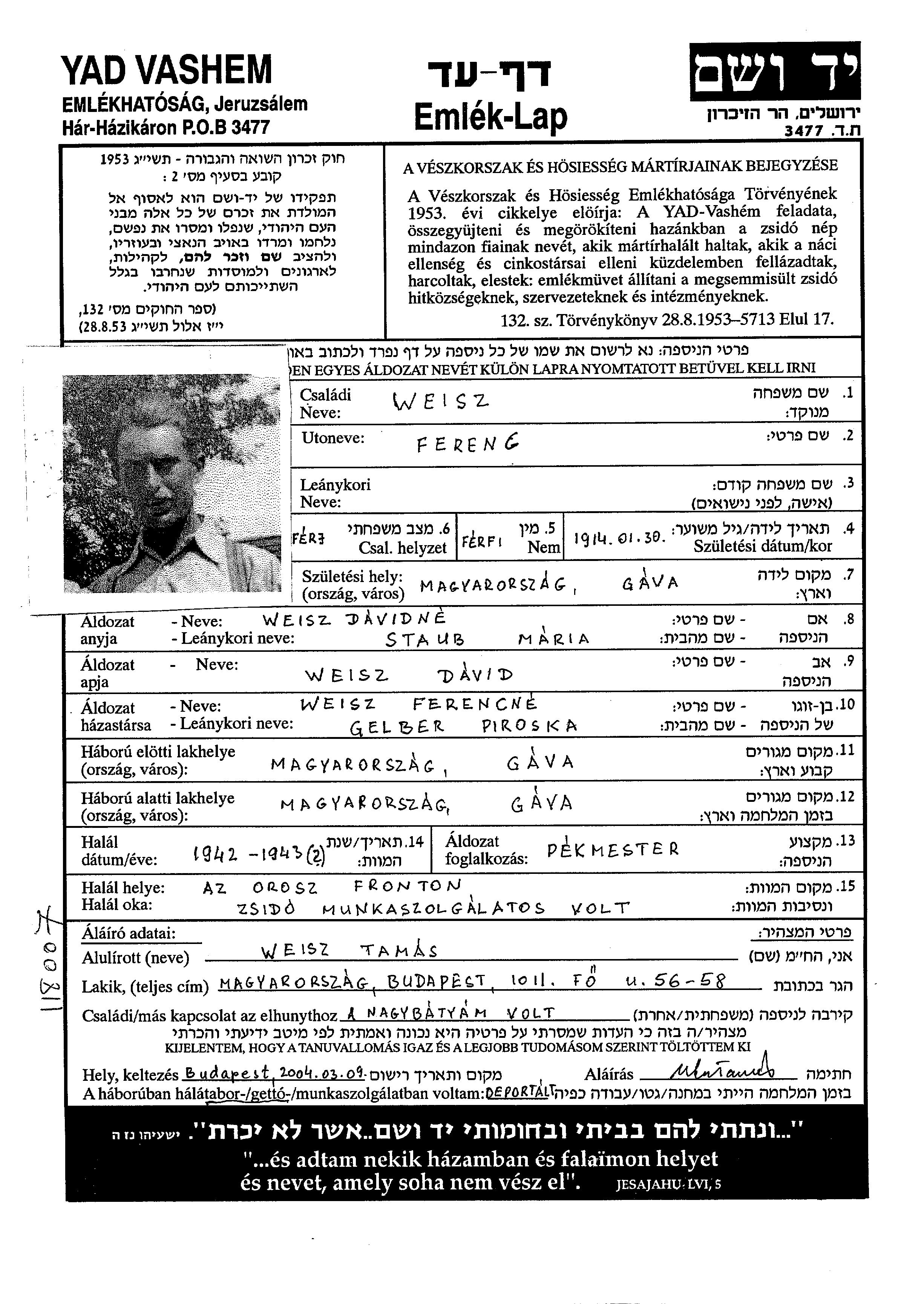 | Weisz | Ferenc | 1914 | Gava, Hongrie | Liste des Juifs de Hongrie assassinés |