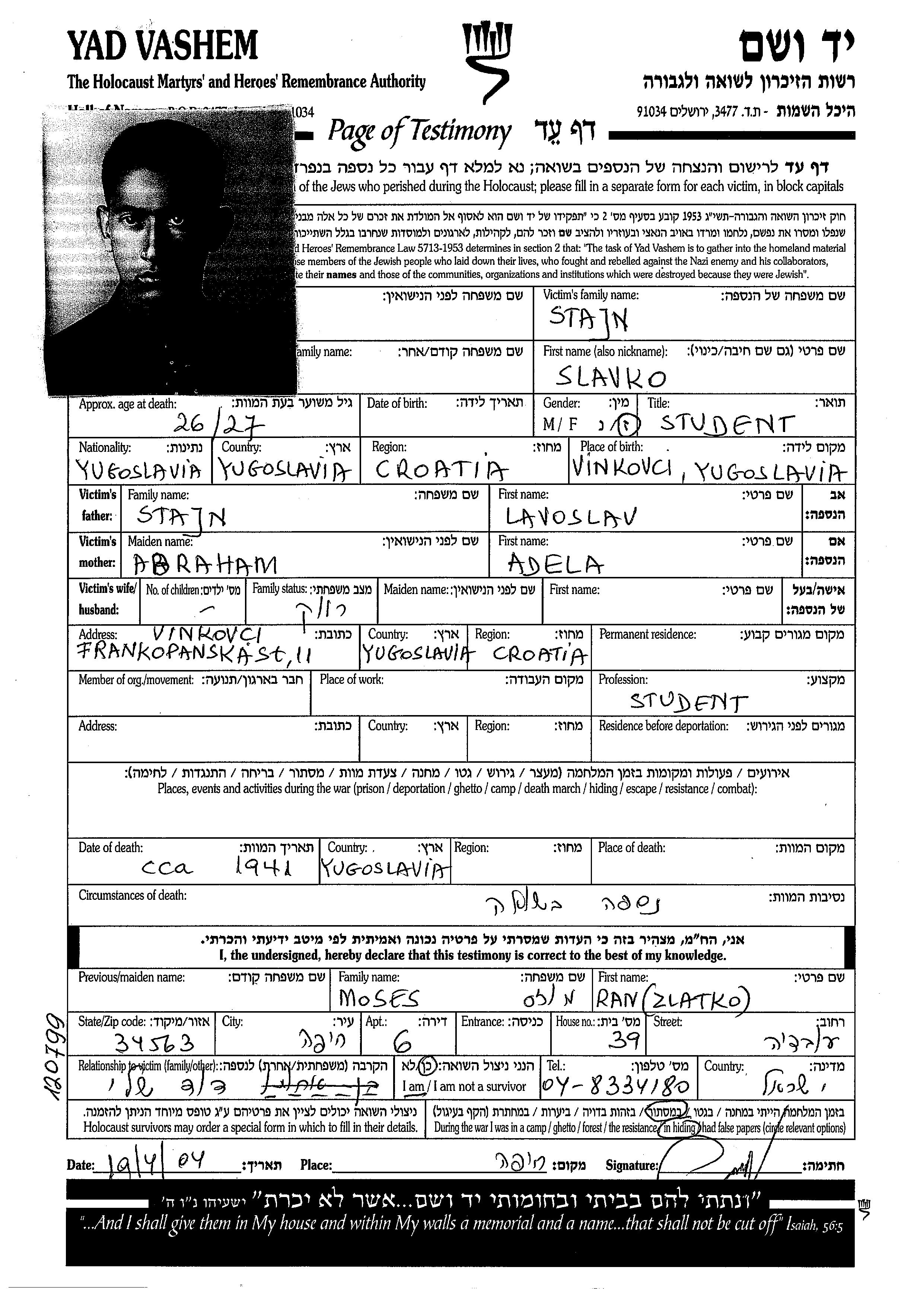 Stajn | Slavko | 1915 | Vinkovci, Yugoslavie | Feuille de témoignage |