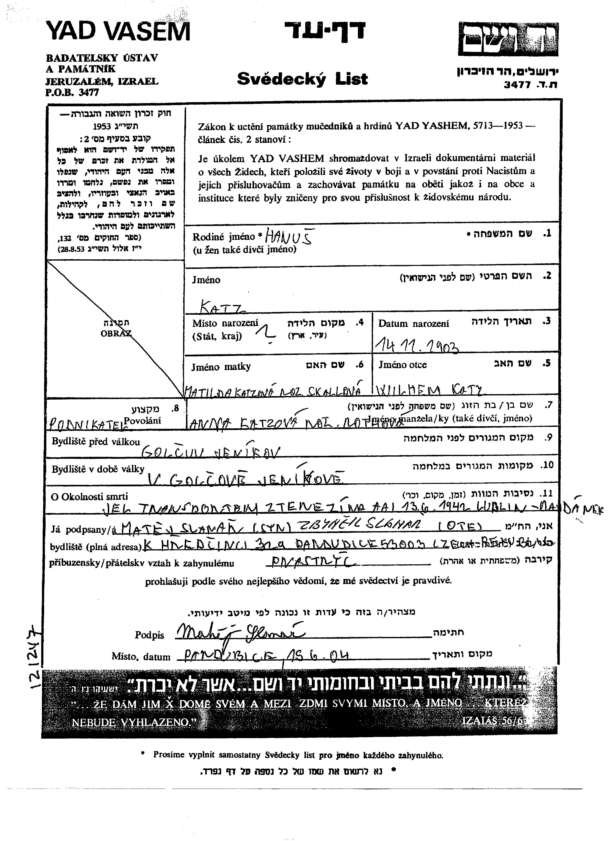 Katz Hanus 1903 Golcuv Jenikov, Tchécoslovaquie Feuille de témoignage