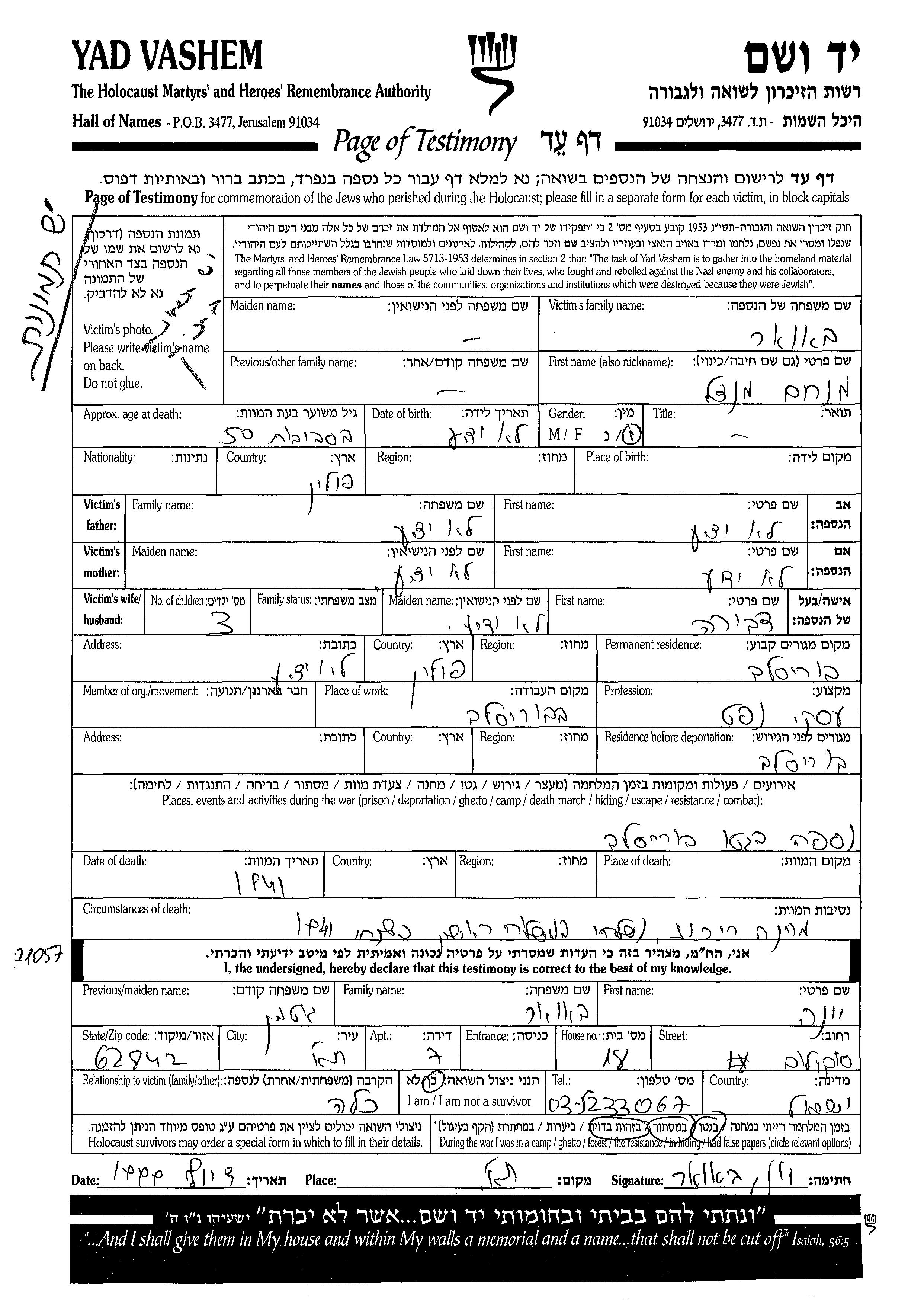 Yad Vashem - Pages of Testimony Names Memorial Collection
