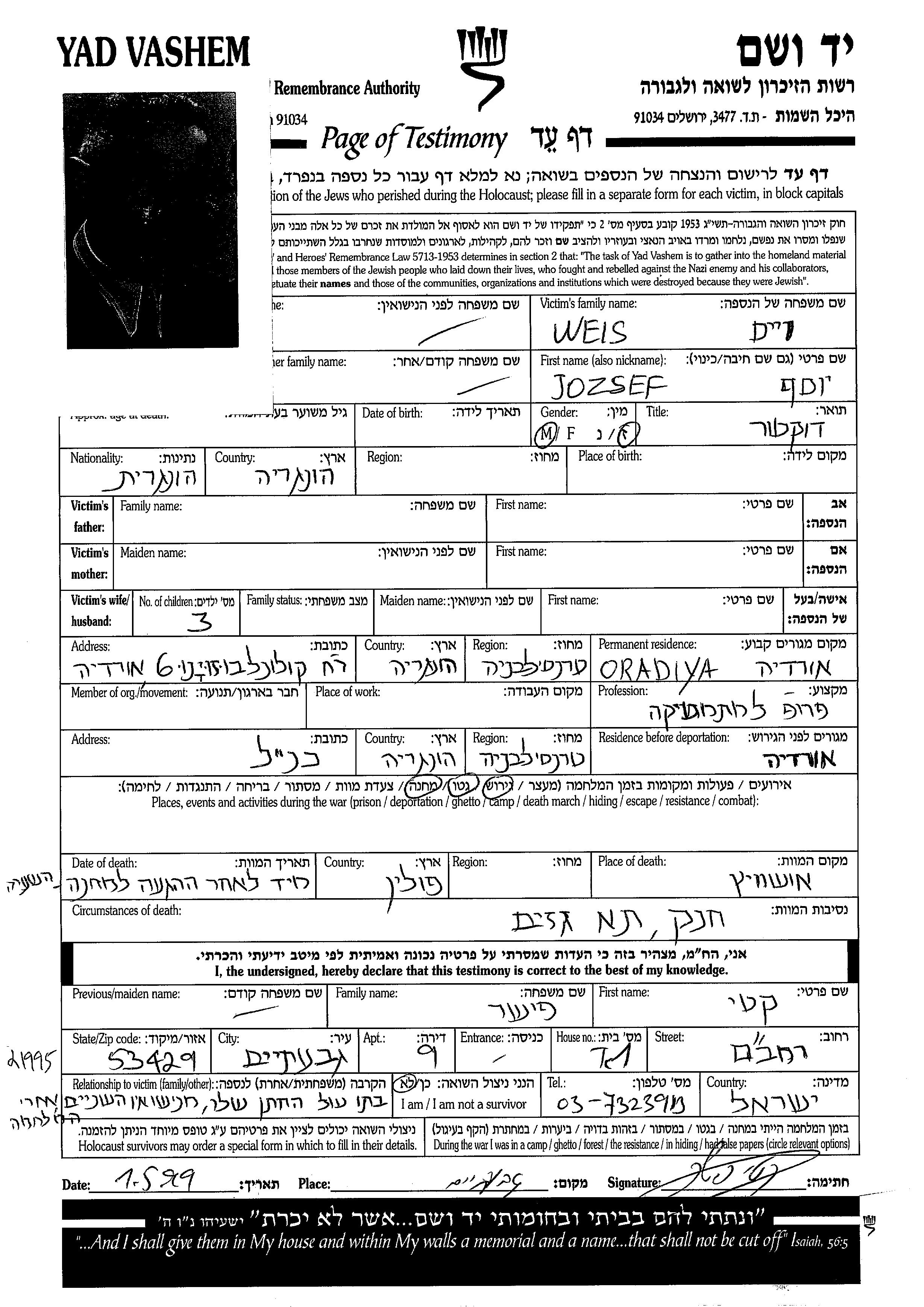 Weis Jozsef Oradea, Roumanie Feuille de témoignage