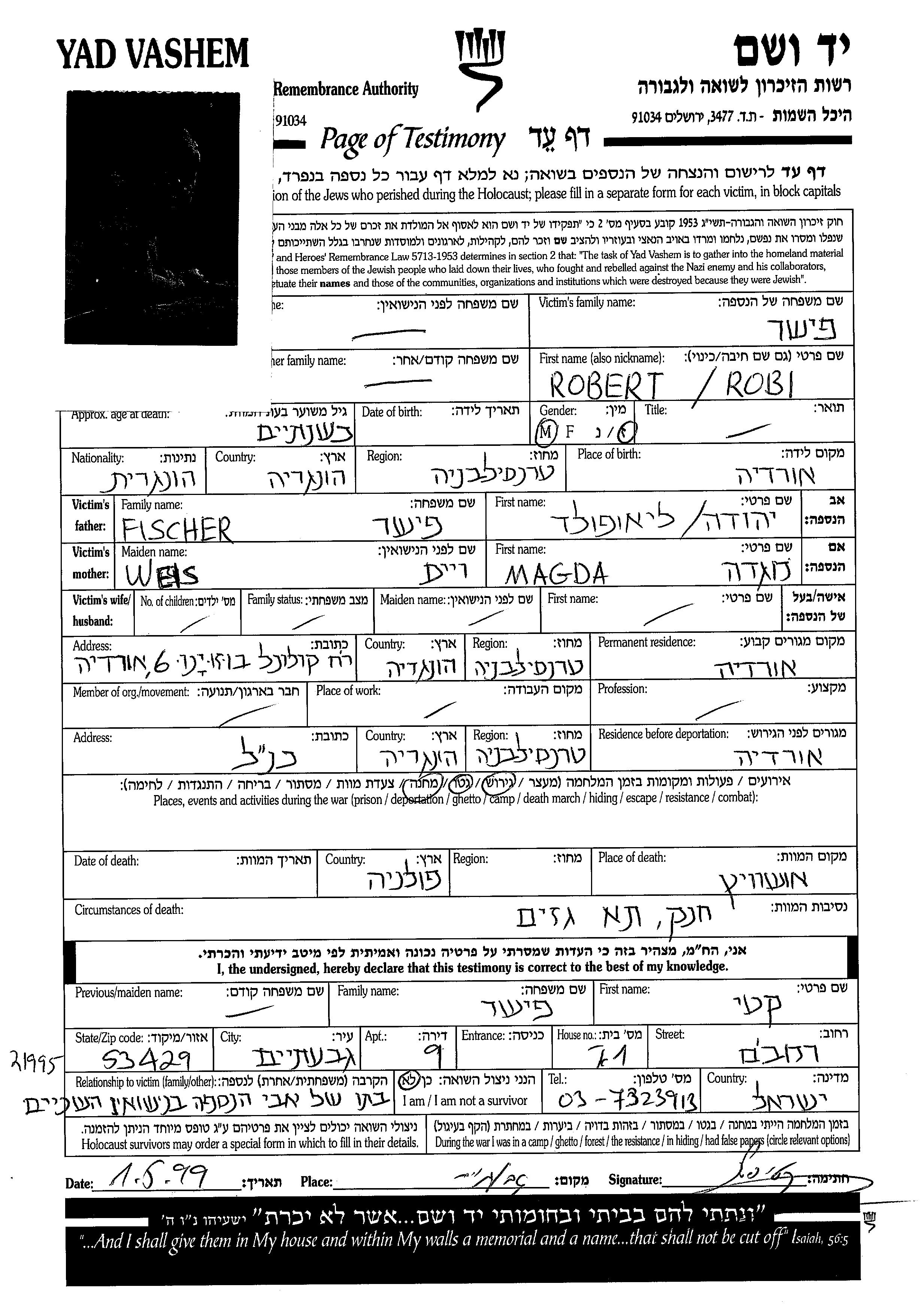 Fischer Robert Nagyvarad, Roumanie Feuille de témoignage
