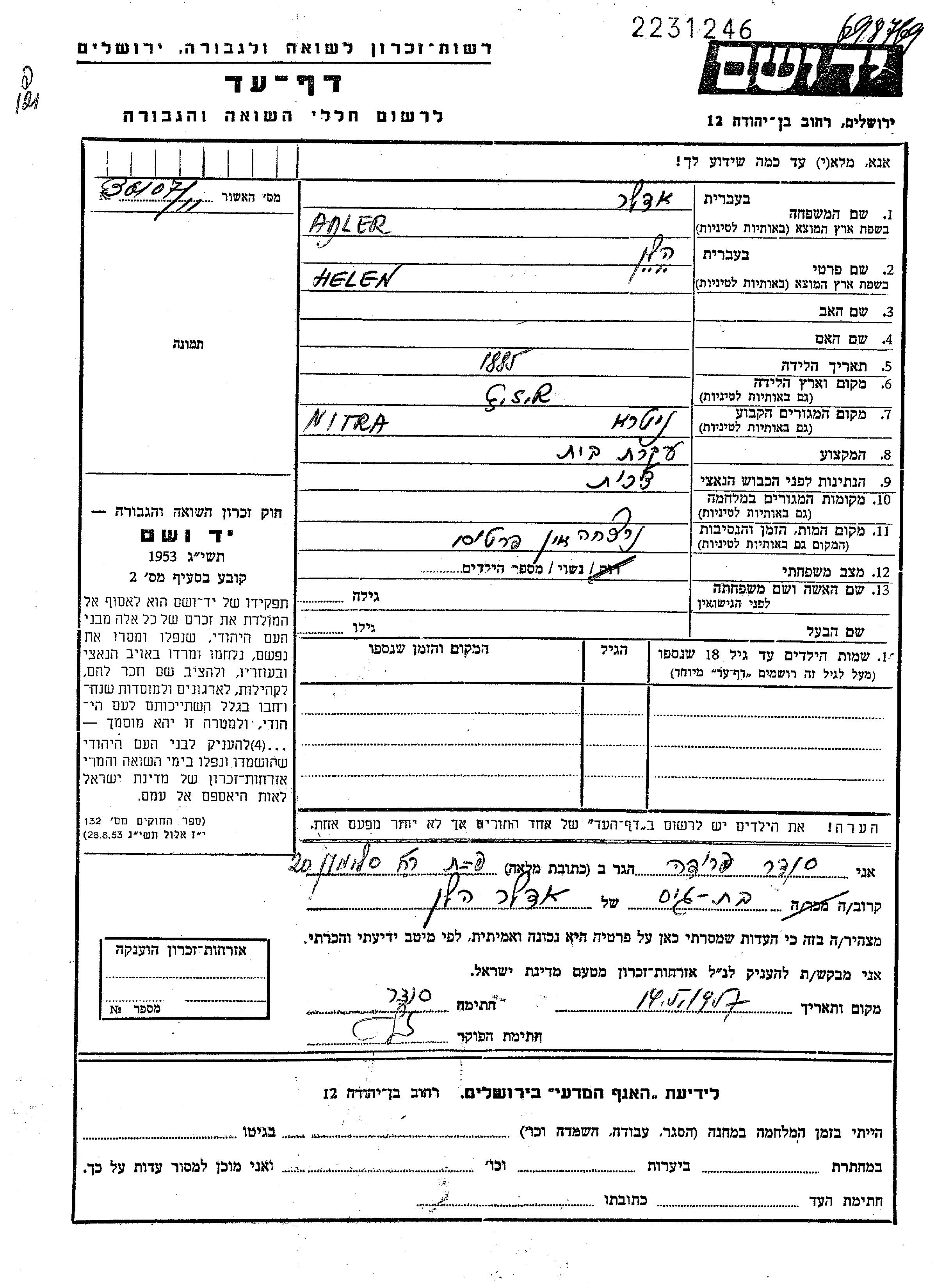 Adler Helen 1885 Nitra, Tchécoslovaquie Feuille de témoignage