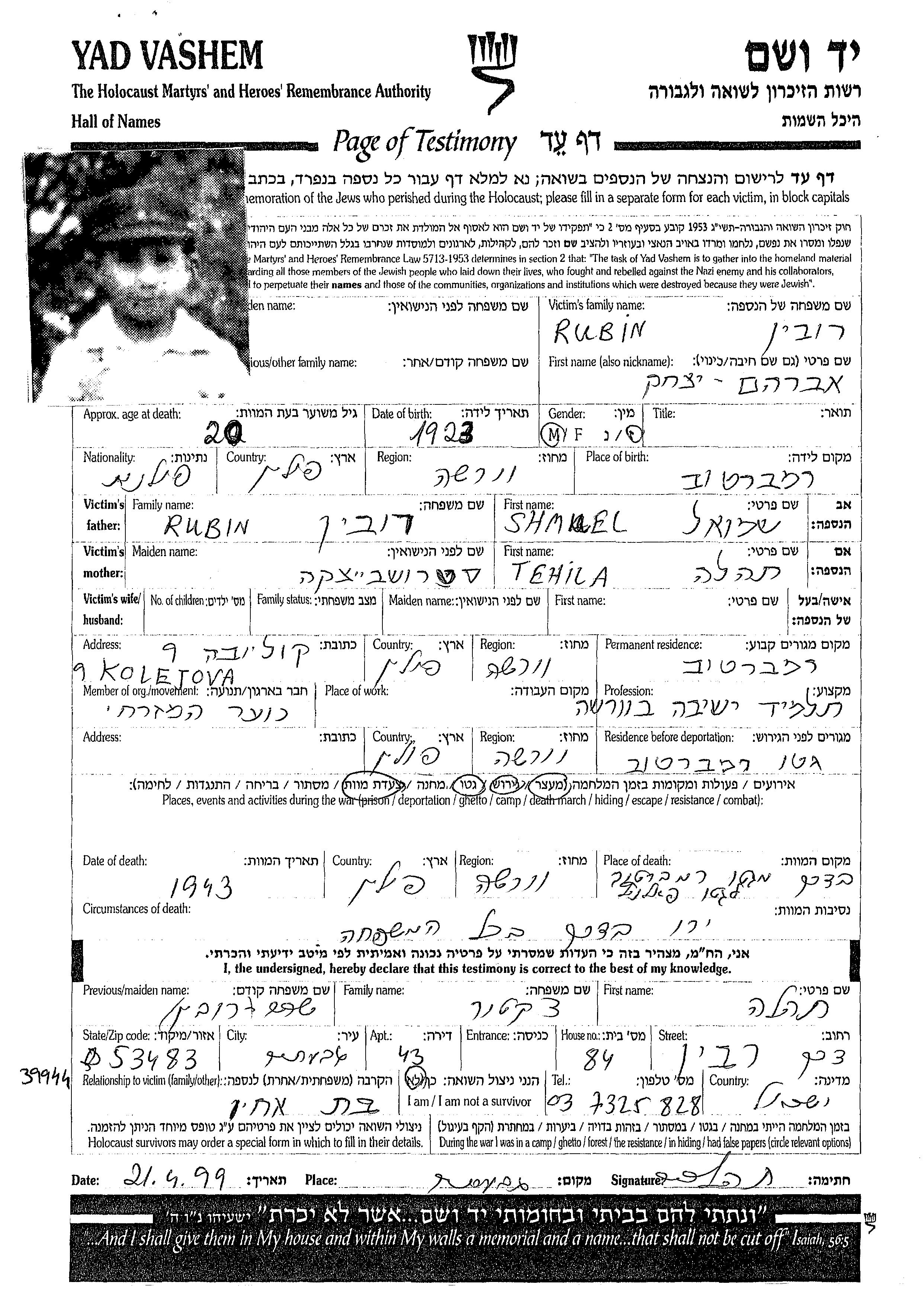 Rubin Yitzkhak Avraham 1923 Rembertow, Pologne Feuille de témoignage