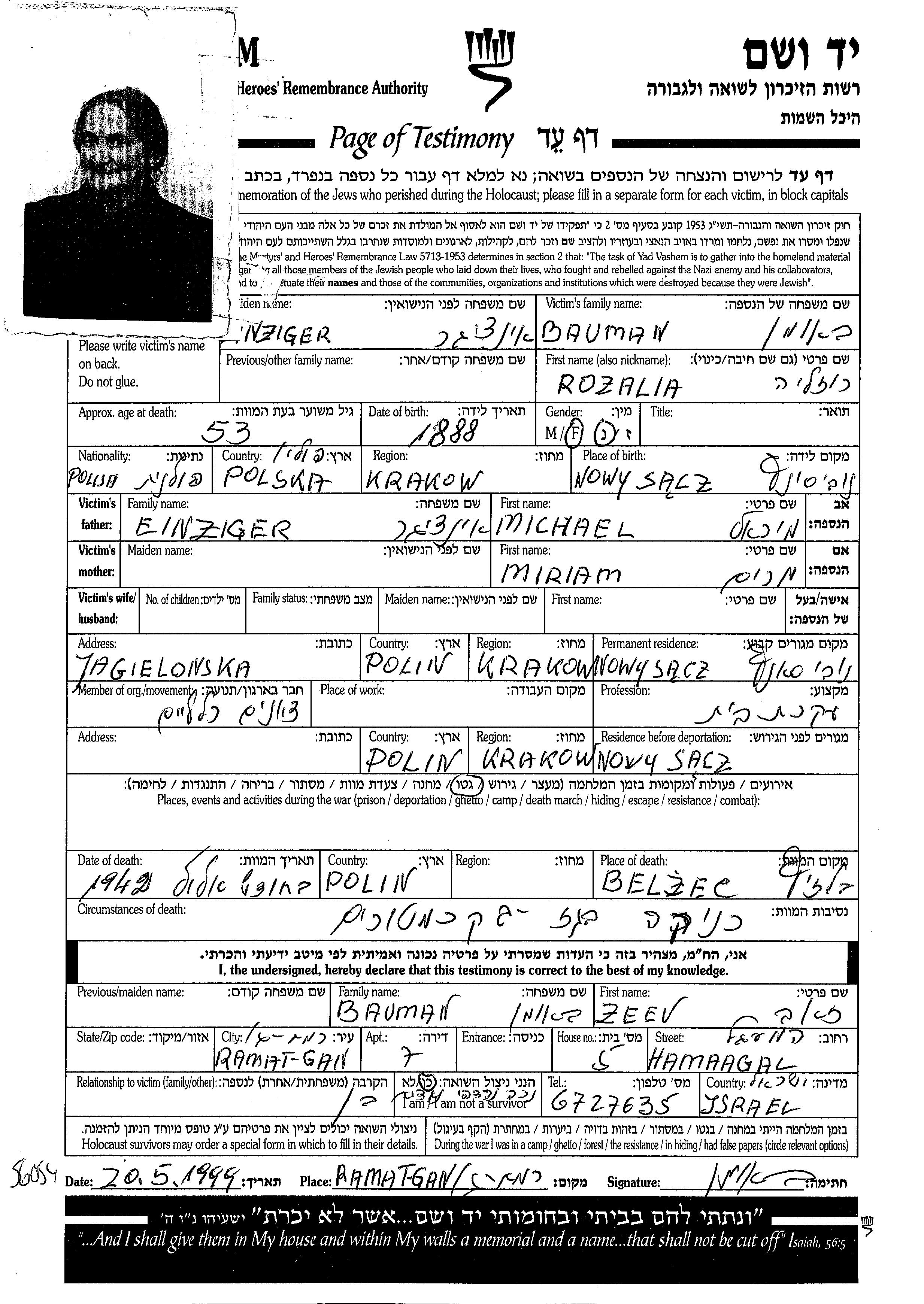 Bauman Rozalia 1888 Nowy Sącz, Pologne Feuille de témoignage