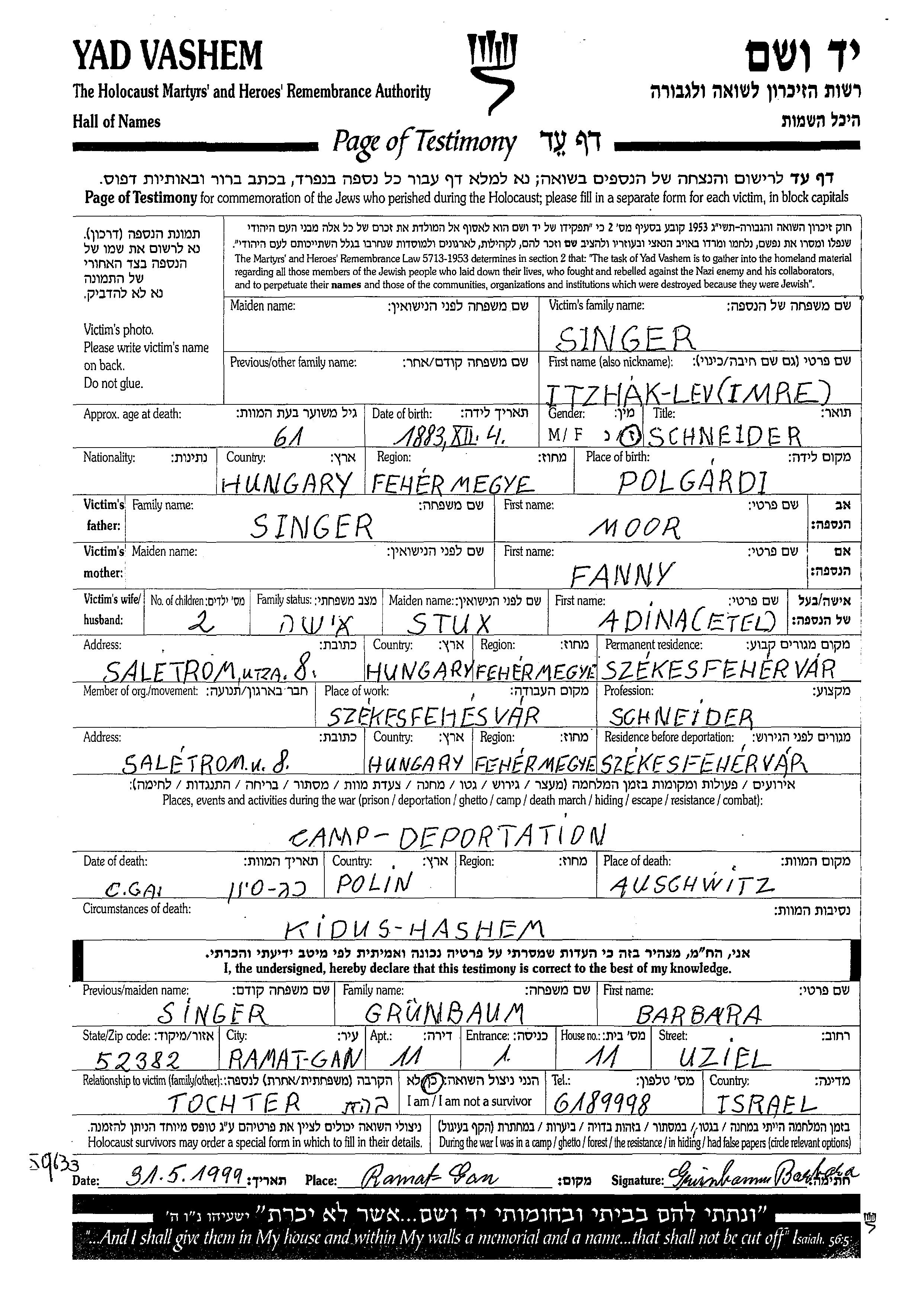 Imre Lev Itzhak Singer est né à Polgardi, Hongrie en 1883. Il était Tailleur. Avant la seconde guerre mondiale il vivait à Szekesfehervar, Hongrie.