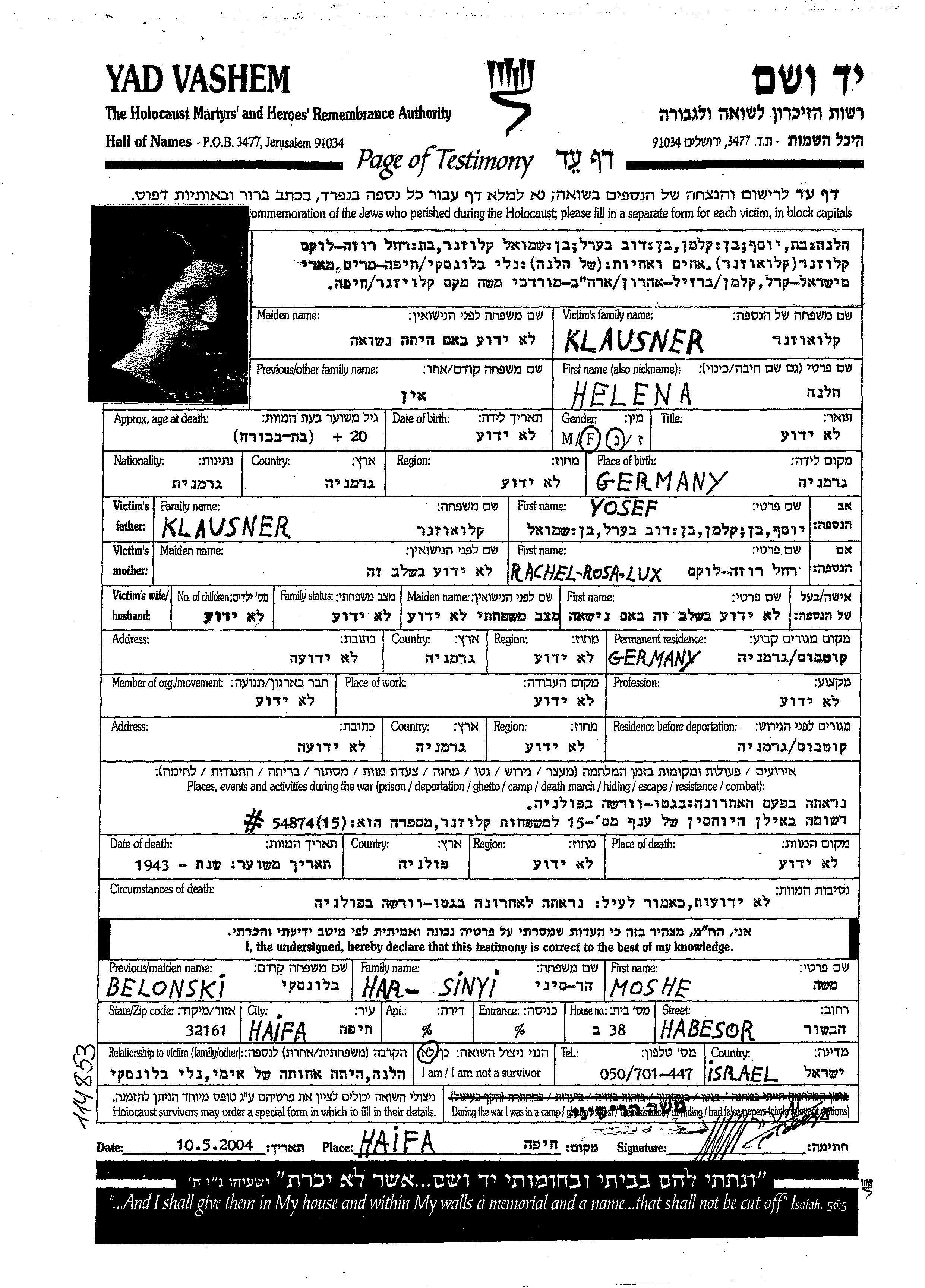Klausner Helena Kottbus, Allemagne Feuille de témoignage
