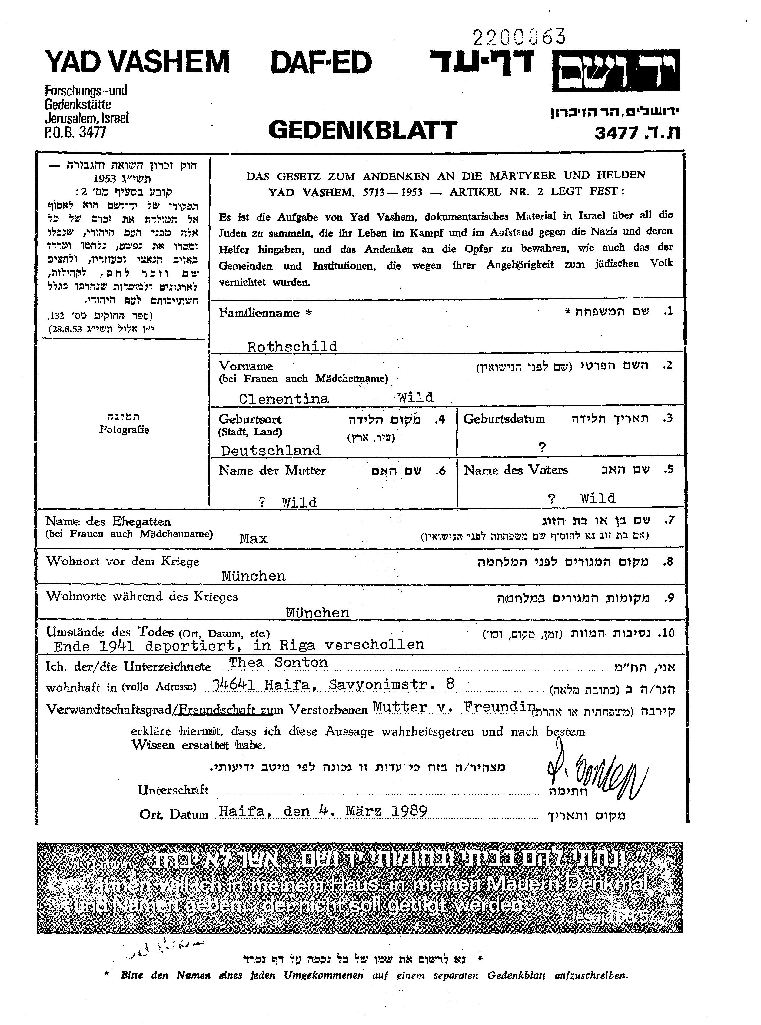 Clementina Rotschild née Wild est née à Allemagne. Elle était Mariée à Max. Avant la seconde guerre mondiale elle vivait à Muenchen, Allemagne. Pendant la guerre, elle était à Muenchen, Allemagne.