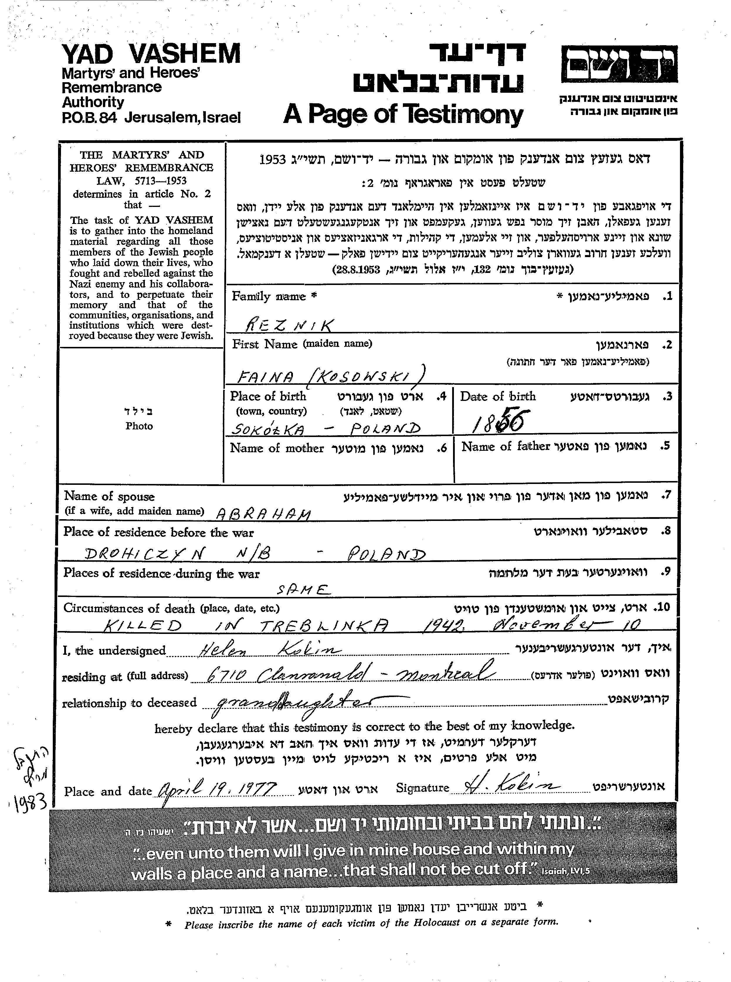 Reznik Faina endroit inconnu, Feuille de témoignage