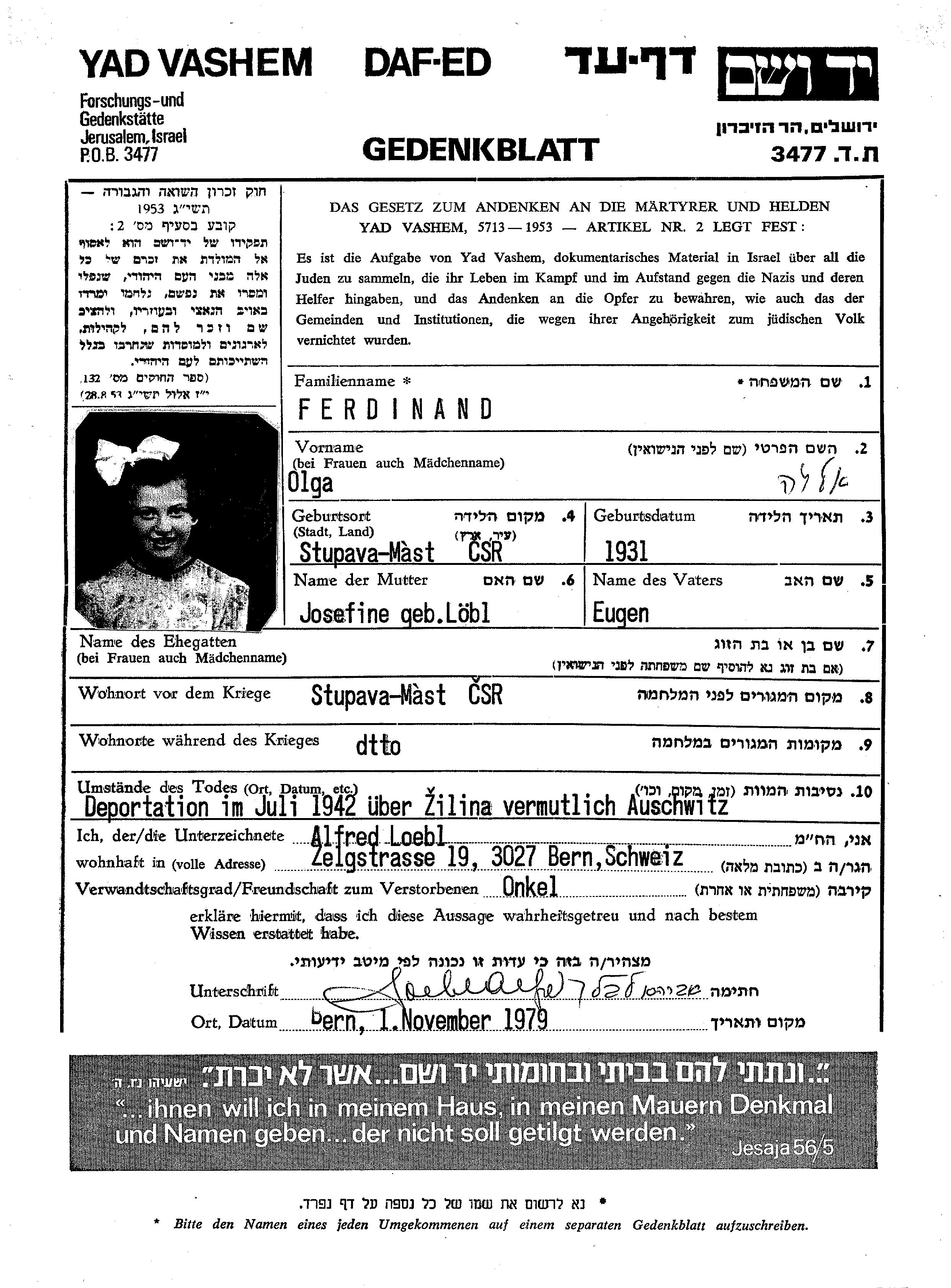Ferdinand Olga 1931 Stupava, Tchécoslovaquie Feuille de témoignage