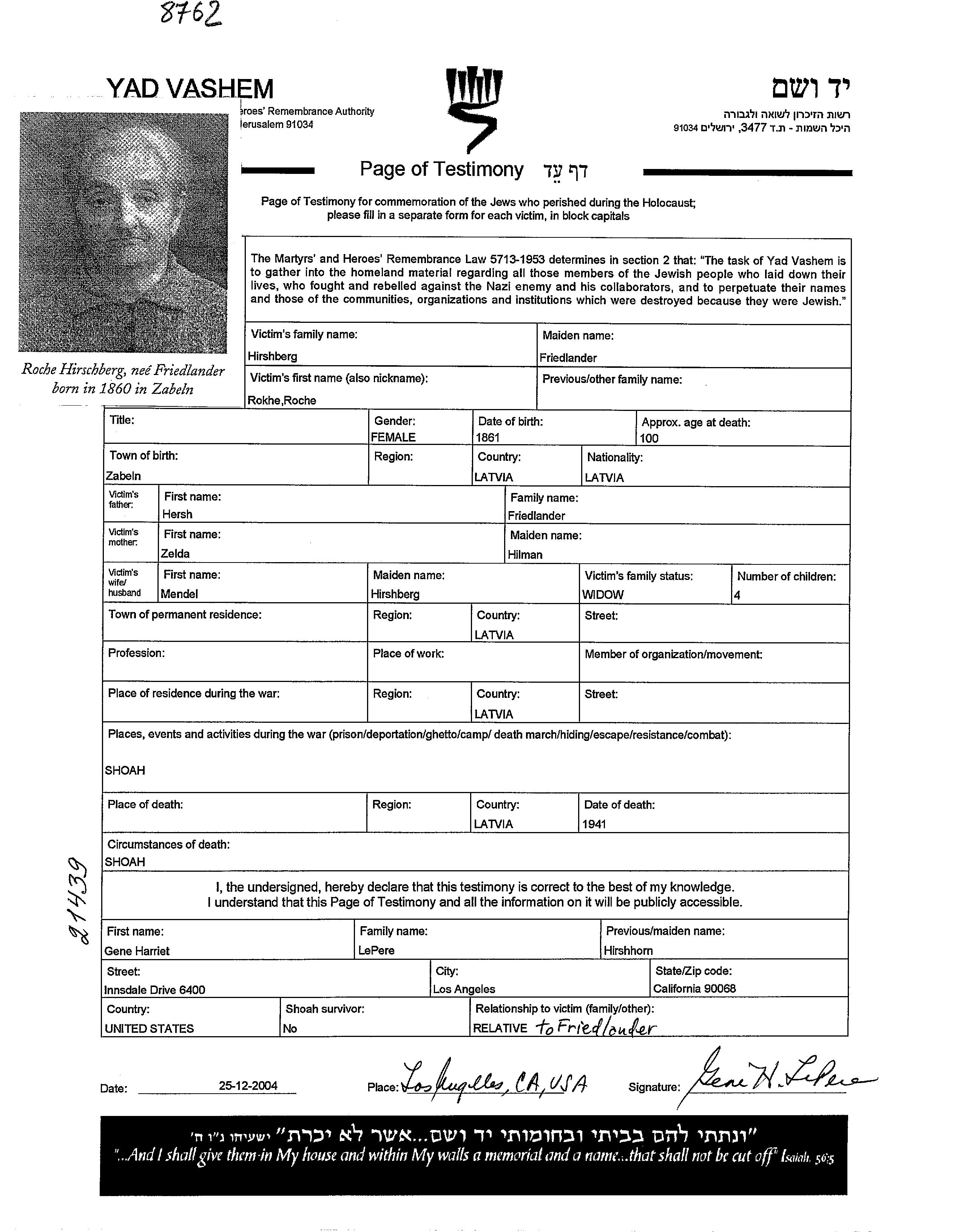Rokhe Hirshberg née Friedlander est née à Sabile, Lettonie en 1861. Avant la seconde guerre mondiale elle vivait à Lettonie.